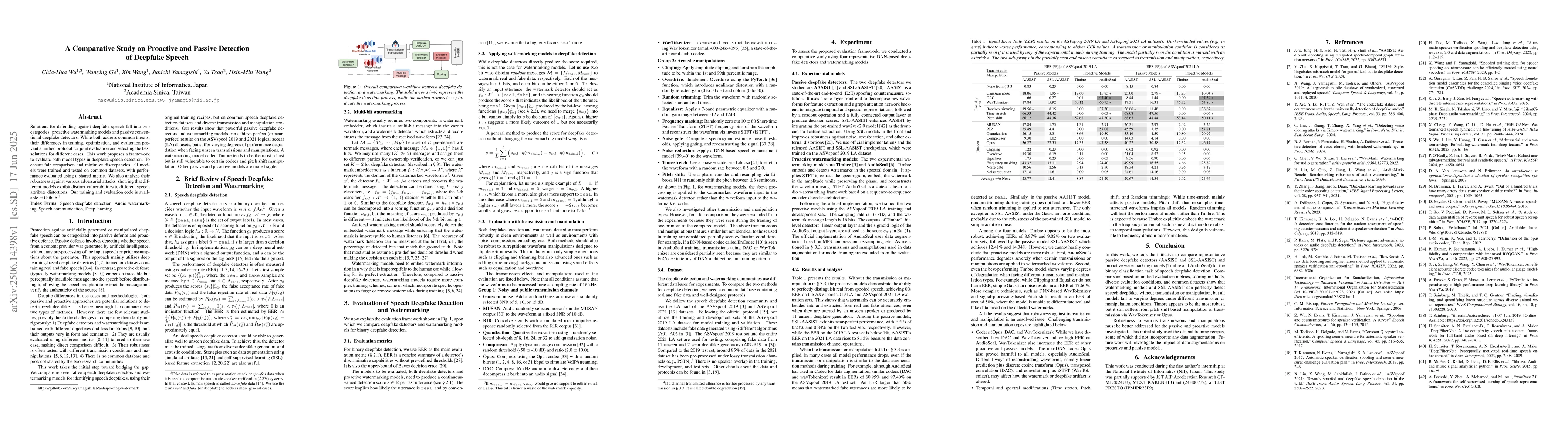 Solutions for defending against deepfake speech fall into two categories: proactive watermarking models and passive conventional deepfake detectors. While both address common threats, their differences in training, optimization, and evaluation prevent a unified protocol for joint evaluation and selecting the best solutions for different cases. This work proposes a framework to evaluate both model types in deepfake speech detection. To ensure fair comparison and minimize discrepancies, all models were trained and tested on common datasets, with performance evaluated using a shared metric. We also analyze their robustness against various adversarial attacks, showing that different models exhibit distinct vulnerabilities to different speech attribute distortions. Our training and evaluation code is available at Github.