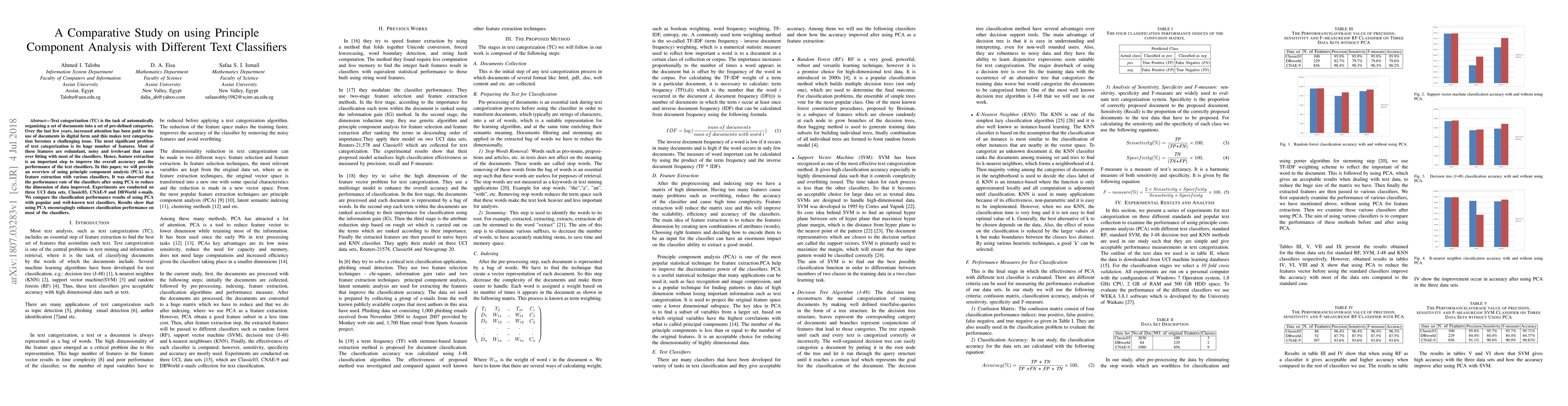 Text categorization (TC) is the task of automatically organizing a set of documents into a set of pre-defined categories. Over the last few years, increased attention has been paid to the use of documents in digital form and this makes text categorization becomes a challenging issue. The most significant problem of text categorization is its huge number of features. Most of these features are redundant, noisy and irrelevant that cause over fitting with most of the classifiers. Hence, feature extraction is an important step to improve the overall accuracy and the performance of the text classifiers. In this paper, we will provide an overview of using principle component analysis (PCA) as a feature extraction with various classifiers. It was observed that the performance rate of the classifiers after using PCA to reduce the dimension of data improved. Experiments are conducted on three UCI data sets, Classic03, CNAE-9 and DBWorld e-mails. We compare the classification performance results of using PCA with popular and well-known text classifiers. Results show that using PCA encouragingly enhances classification performance on most of the classifiers.