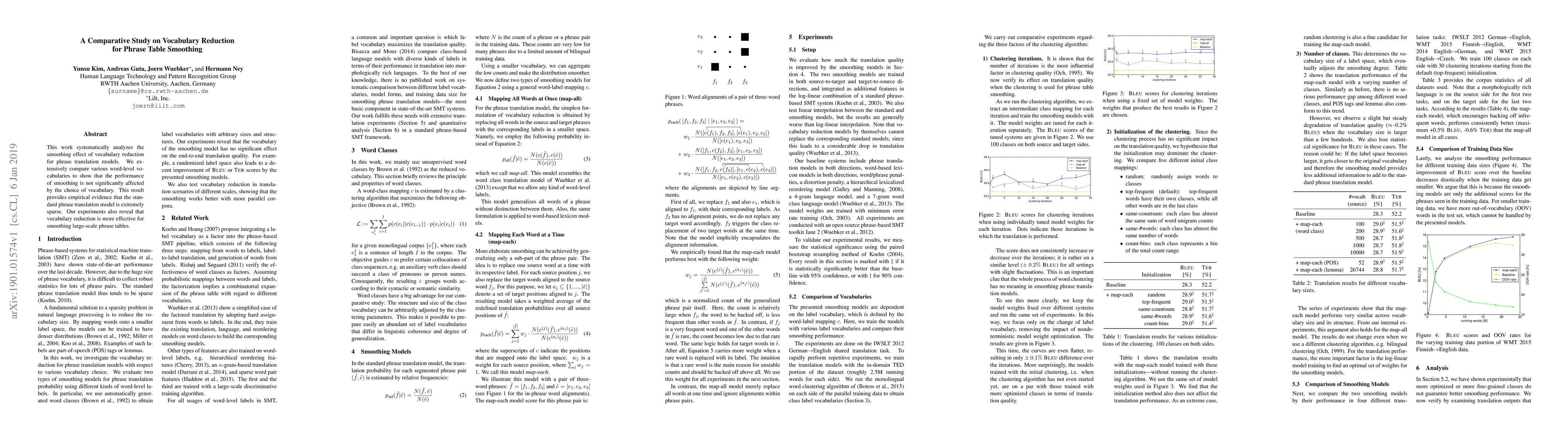 This paper compares vocabulary reduction for phrase table smoothing in machine translation models, finding that it has little impact on performance and is more effective for large-scale tables.