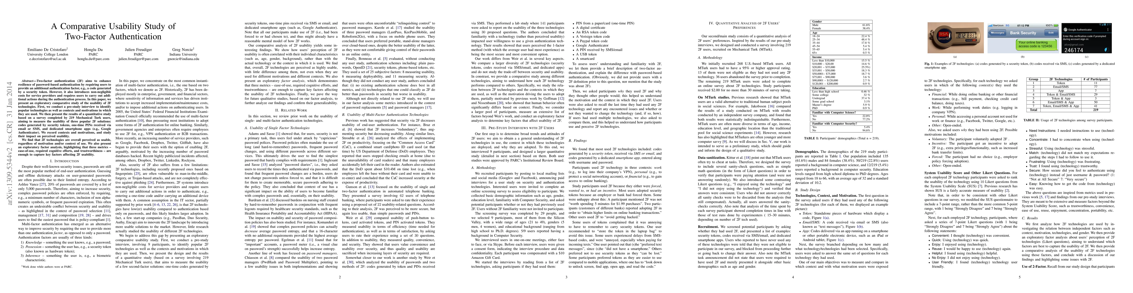 This paper conducts a comparative usability study of three popular two-factor authentication methods: security token codes, one-time PINs via email/SMS, and smartphone apps. Findings from a survey of 219 users indicate that these 2F technologies are generally perceived as usable, with ease-of-use, cognitive effort, and trustworthiness being key factors.