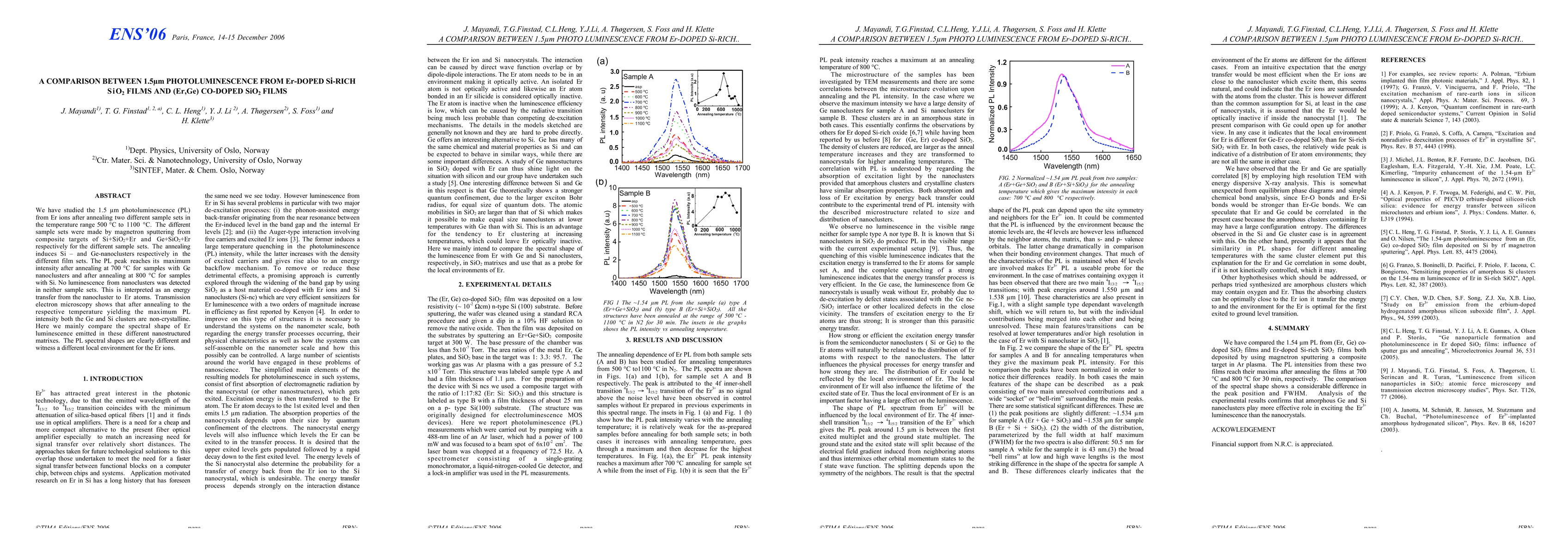 This study compares the 1.5 µm photoluminescence from Er-doped Si-rich and (Er,Ge) co-doped SiO2 films, revealing that the PL peak intensity is maximized at different annealing temperatures for each sample set, indicating different energy transfer mechanisms and local environments for Er ions in the non-crystalline Si and Ge nanoclusters.