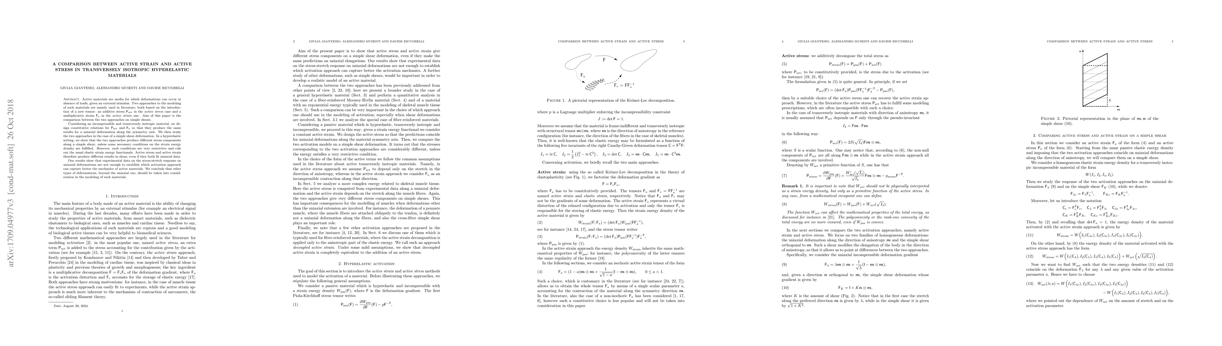 This paper compares active stress and active strain models for transversely isotropic hyperelastic materials, showing that while both approaches fit uniaxial deformation data, they yield different results under simple shear. The study concludes that uniaxial data alone is insufficient to determine the best activation approach, advocating for the consideration of additional deformation types in modeling.