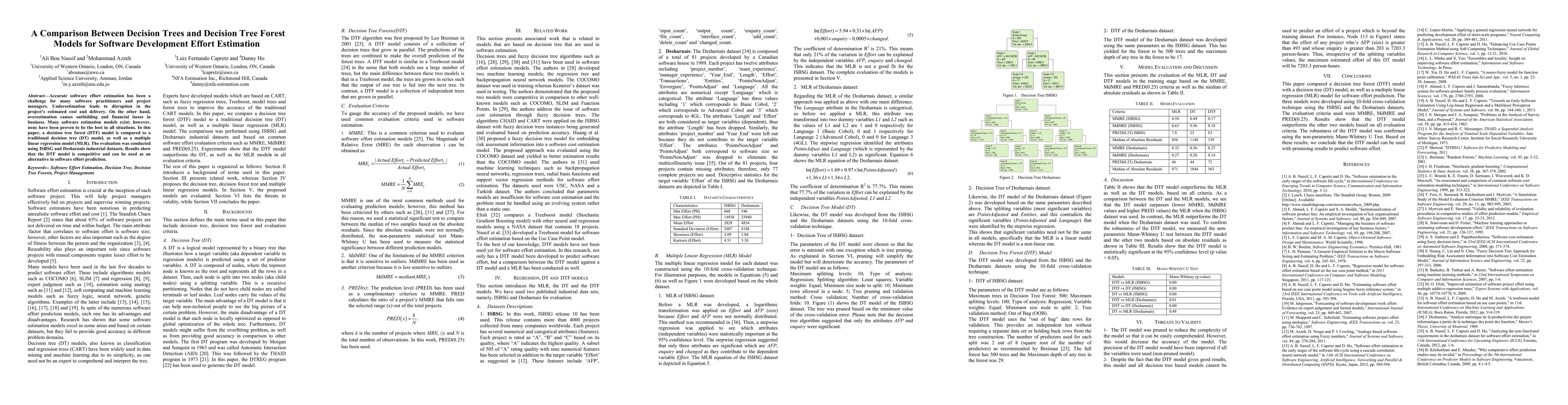 This paper compares decision tree forest (DTF) models with traditional decision tree (DT) and multiple linear regression (MLR) models for software development effort estimation, using ISBSG and Desharnais datasets. Results indicate that DTF models are competitive alternatives for accurate effort prediction.