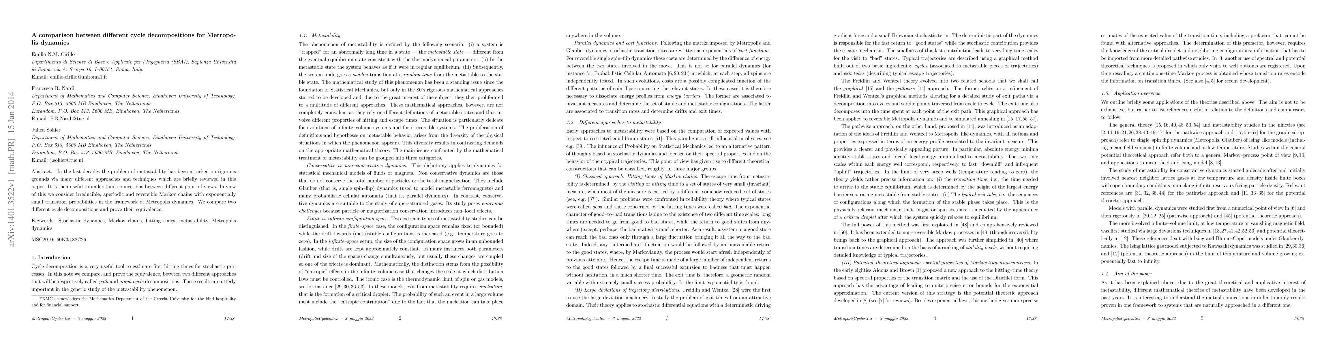 In the last decades the problem of metastability has been attacked on rigorous grounds via many different approaches and techniques which are briefly reviewed in this paper. It is then useful to understand connections between different point of views. In view of this we consider irreducible, aperiodic and reversible Markov chains with exponentially small transition probabilities in the framework of Metropolis dynamics. We compare two different cycle decompositions and prove their equivalence.