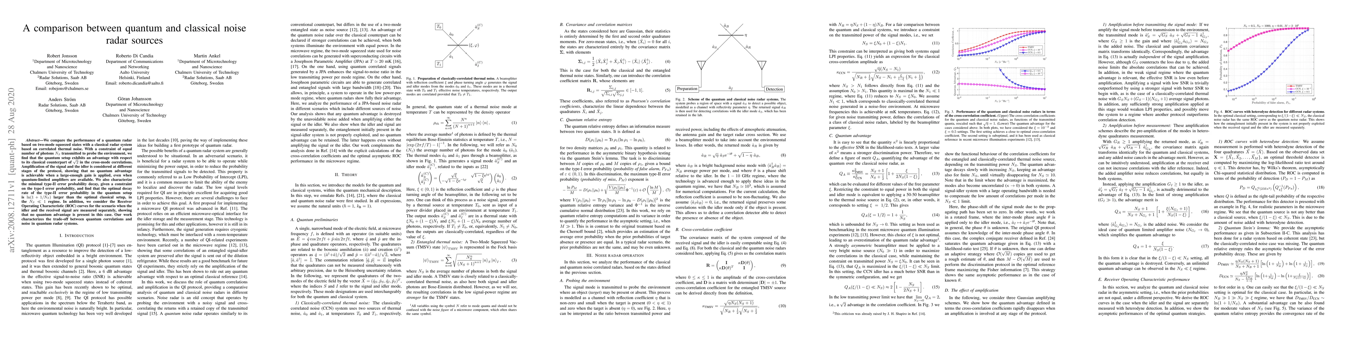 A study compares quantum radar systems using two-mode squeezed states with classical radar systems based on thermal noise, finding no significant advantage in quantum radar for certain metrics.