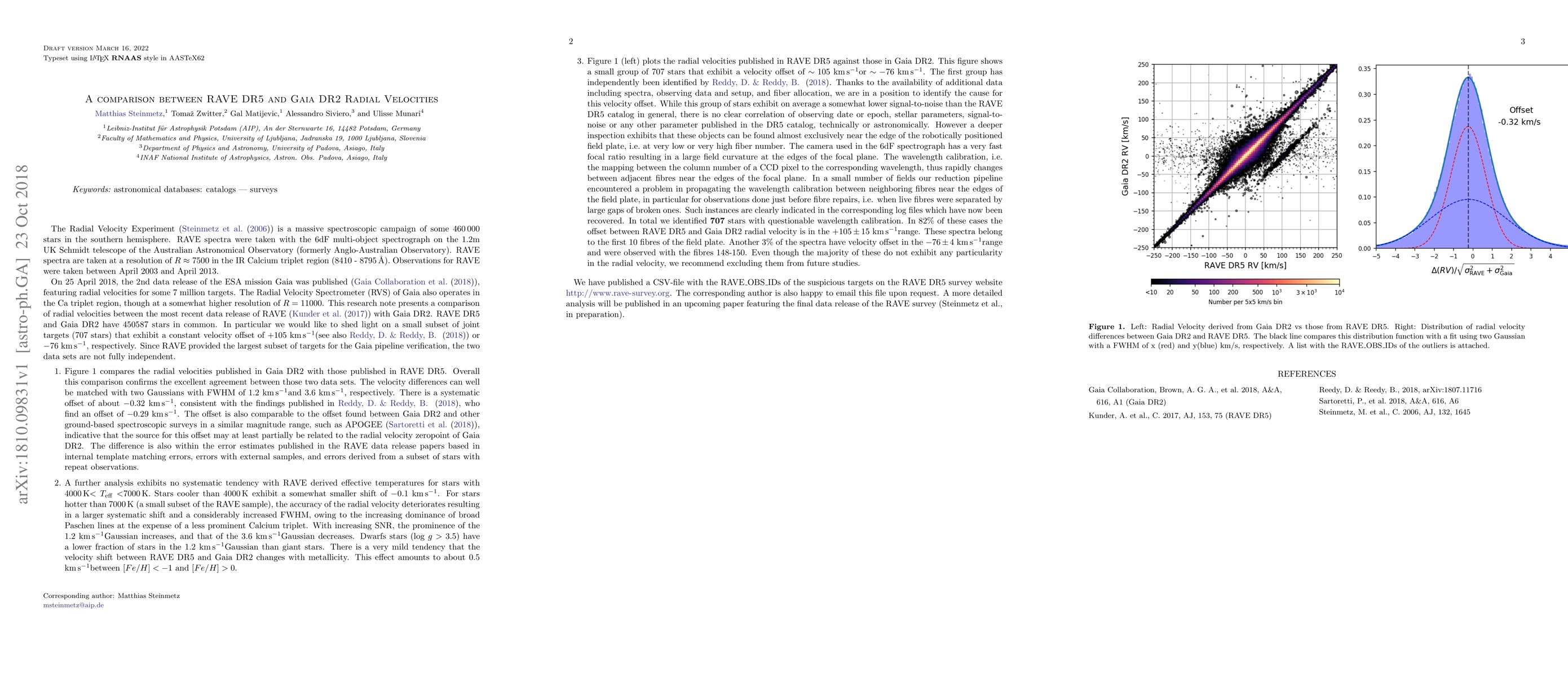 This research note presents a comparison of radial velocities between the RAVE DR5 data release with Gaia DR2. RAVE DR5 and Gaia DR2 have 450587 stars in common. In particular we would like to shed light on a small subset of joint targets (707 stars) that exhibit a constant velocity offset of +105 km/s or -76 km/s, respectively. Overall this comparison confirms the excellent agreement between those two data sets. The velocity differences can well be matched with two Gaussians with FWHM of 1.2 km/s and 3.6 km/s, respectively. There is a systematic offset of about -0.32 km/s, consistent with the findings in Gaia DR2, who find an offset of -0.29 km/s. The offset is also comparable to the offset found between Gaia DR2 and other ground-based spectroscopic surveys in a similar magnitude range, indicative that the source for this offset may at least partially be related to the radial velocity zeropoint of Gaia DR2. We identified 707 stars that exhibit large constant velocity offsets. These cases can be traced to a problem of the reduction pipeline in propagating the wavelength calibration between neighboring fibres near the edges of the field plate, in particular for observations done just before fibre repairs, i.e. when live fibres were separated by large gaps of broken ones. In 82\%\ of these cases the offset between RAVE DR5 and Gaia DR2 radial velocity is in the $+105 \pm 15$~\kms range. These spectra belong to the first 10 fibres of the field plate. Another 3\%\ of the spectra have velocity offset in the $-76 \pm 4$~\kms range and were observed with the fibres 148-150. Even though the majority of these 707 stars do not exhibit any particularity in the radial velocity, we recommend excluding them from future studies.
