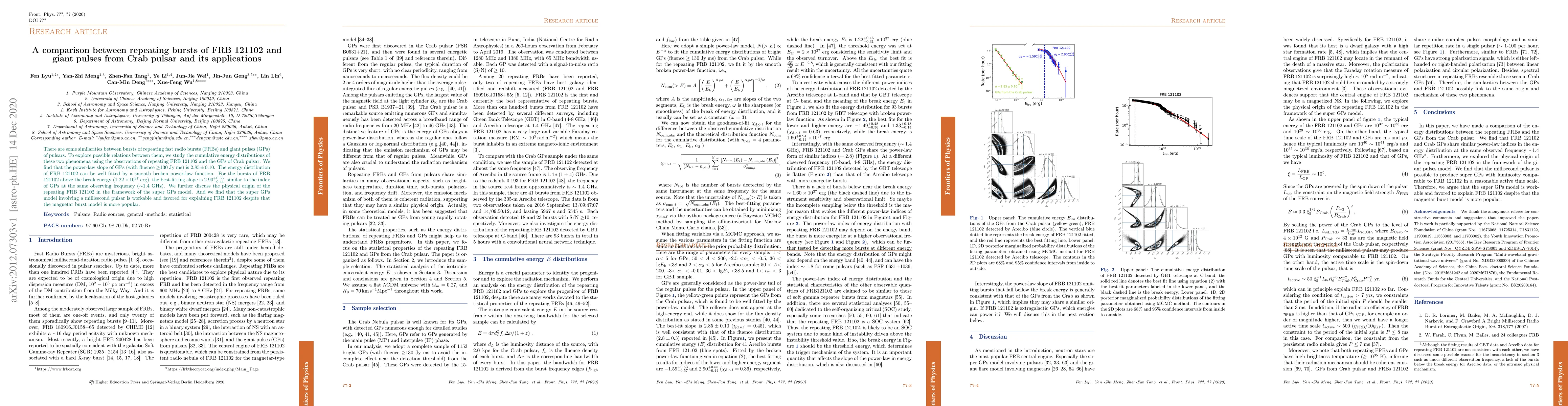 Researchers compared energy distributions of repeating fast radio bursts (FRBs) and giant pulses from a pulsar, finding similarities in power-law slopes and suggesting the super GPs model is favored for explaining FRB 121102.