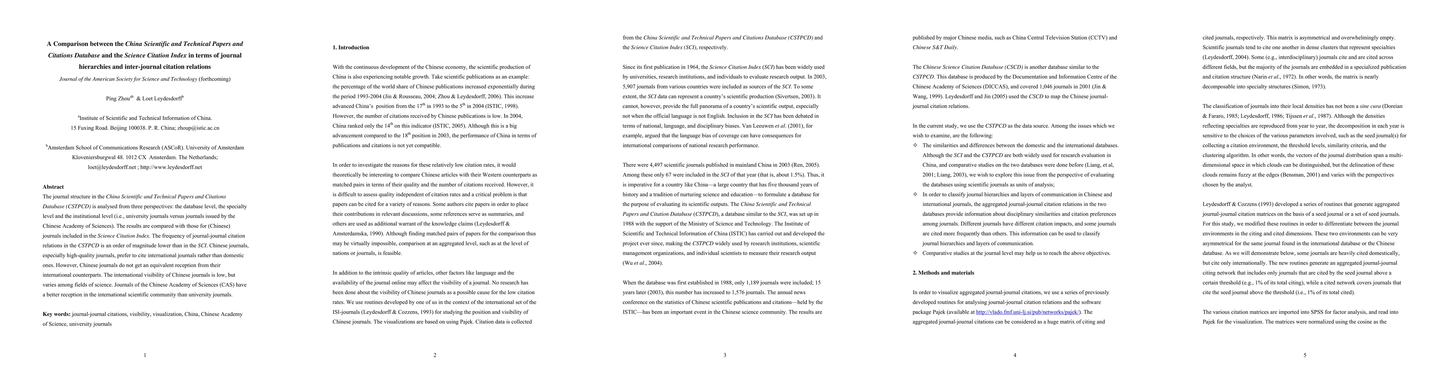 This paper compares the journal hierarchies and citation patterns in China's Scientific and Technical Papers and Citations Database (CSTPCD) with those in the Science Citation Index (SCI), revealing that Chinese journals cite international journals more frequently than domestic ones, despite lower international visibility and varied reception across scientific fields. Journals from the Chinese Academy of Sciences receive better reception internationally than university journals.