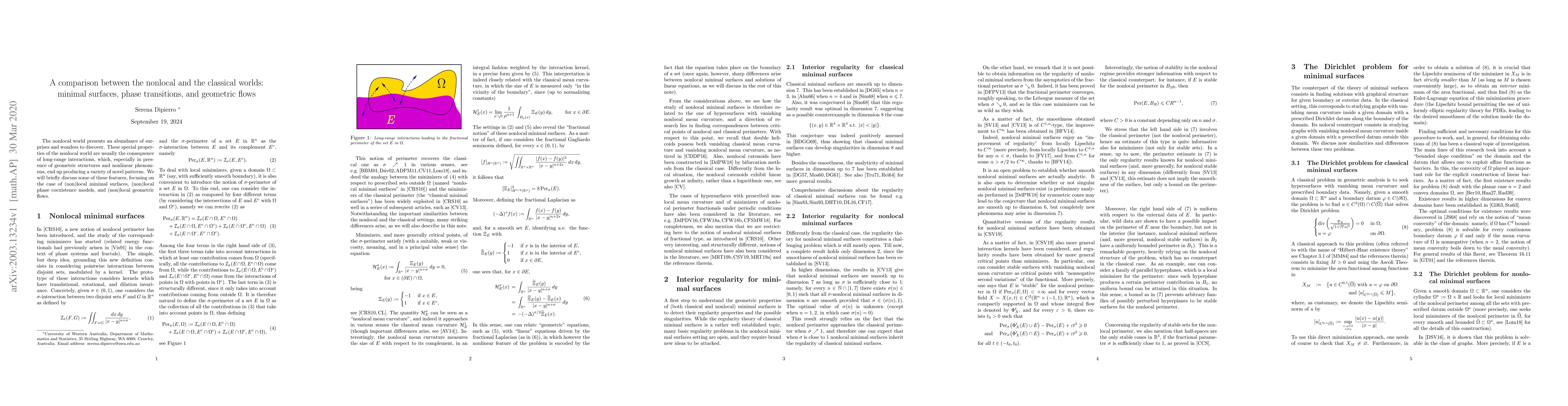 This paper explores the unique properties of the nonlocal world, driven by long-range interactions, and examines novel patterns in (non)local minimal surfaces, phase transitions, and geometric flows. The study highlights the differences and similarities between nonlocal and classical geometric phenomena.