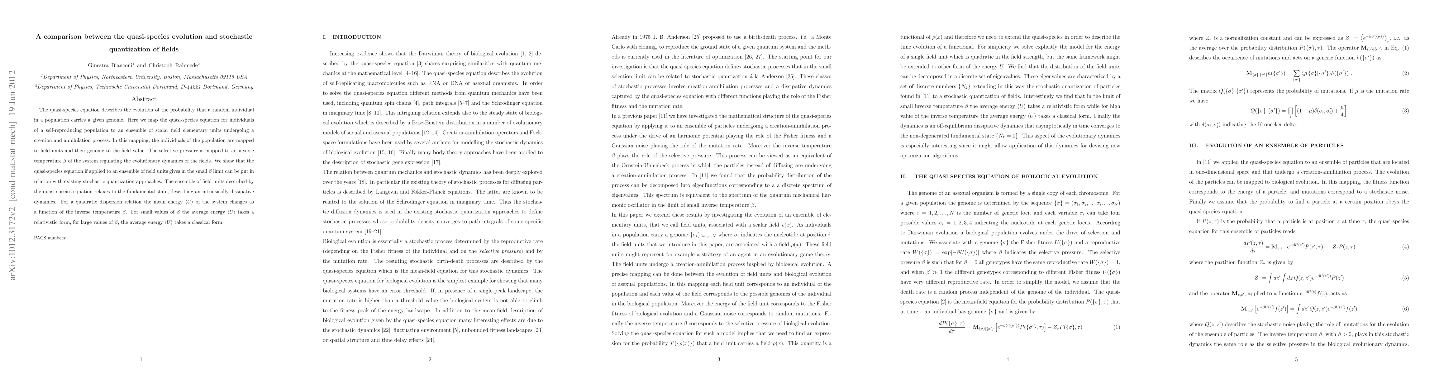 This paper compares the quasi-species evolution of a population to the stochastic quantization of fields, showing that both frameworks converge under certain conditions. It demonstrates that the quasi-species equation applied to field units exhibits intrinsically dissipative dynamics, transitioning from relativistic to classical forms as the inverse temperature varies.