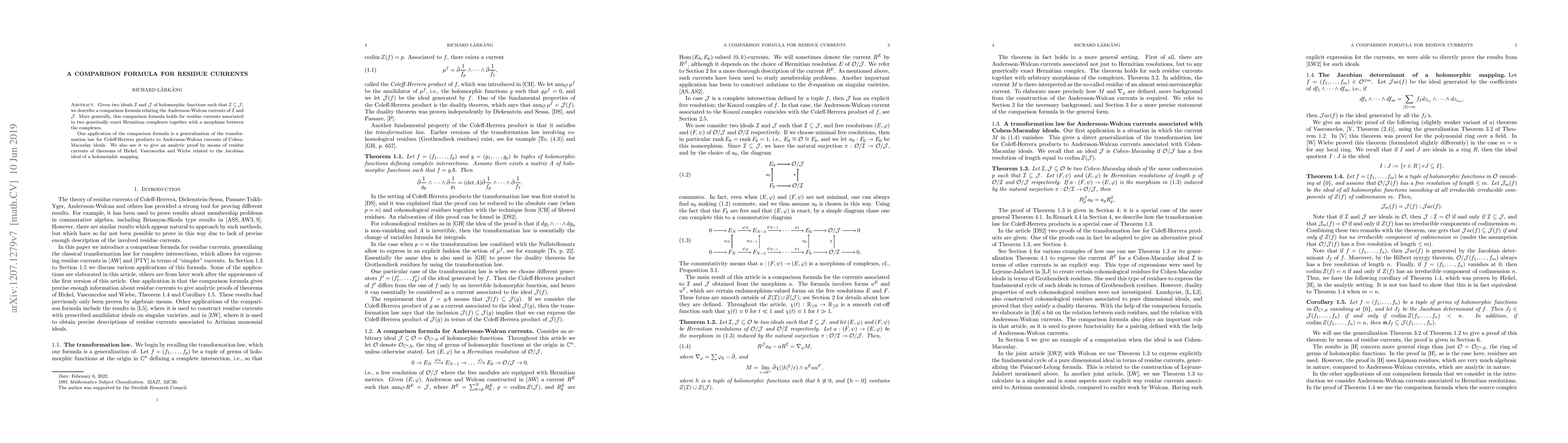This paper presents a comparison formula for residue currents associated with ideals of holomorphic functions, extending it to Hermitian complexes and morphisms between them. It applies the formula to generalize the transformation law for Coleff-Herrera products and to provide an analytic proof for theorems concerning the Jacobian ideal of holomorphic mappings.