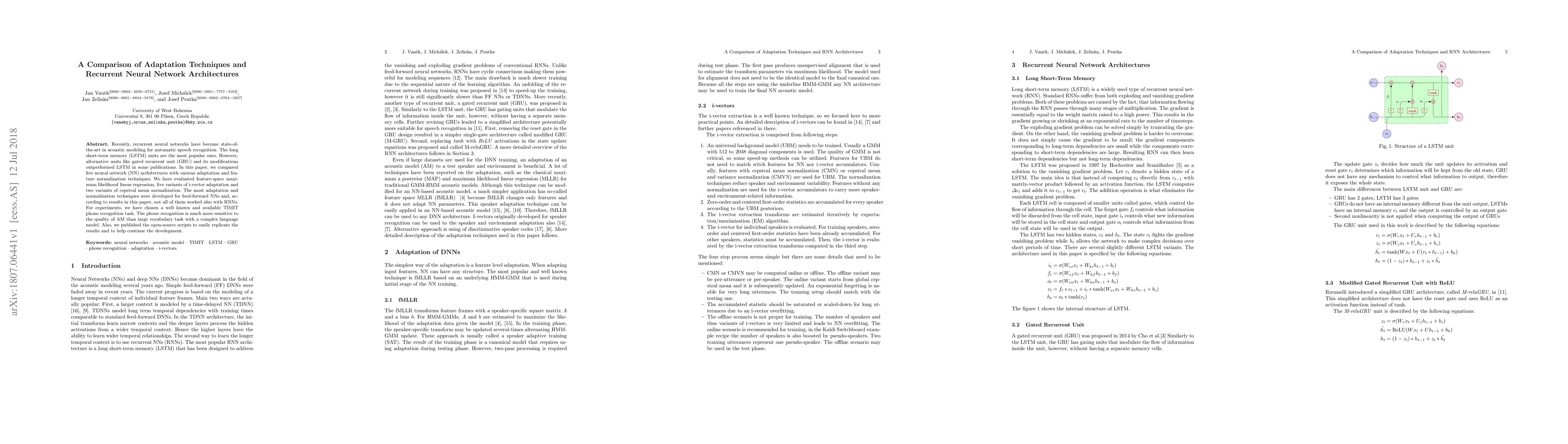 Recently, recurrent neural networks have become state-of-the-art in acoustic modeling for automatic speech recognition. The long short-term memory (LSTM) units are the most popular ones. However, alternative units like gated recurrent unit (GRU) and its modifications outperformed LSTM in some publications. In this paper, we compared five neural network (NN) architectures with various adaptation and feature normalization techniques. We have evaluated feature-space maximum likelihood linear regression, five variants of i-vector adaptation and two variants of cepstral mean normalization. The most adaptation and normalization techniques were developed for feed-forward NNs and, according to results in this paper, not all of them worked also with RNNs. For experiments, we have chosen a well known and available TIMIT phone recognition task. The phone recognition is much more sensitive to the quality of AM than large vocabulary task with a complex language model. Also, we published the open-source scripts to easily replicate the results and to help continue the development.