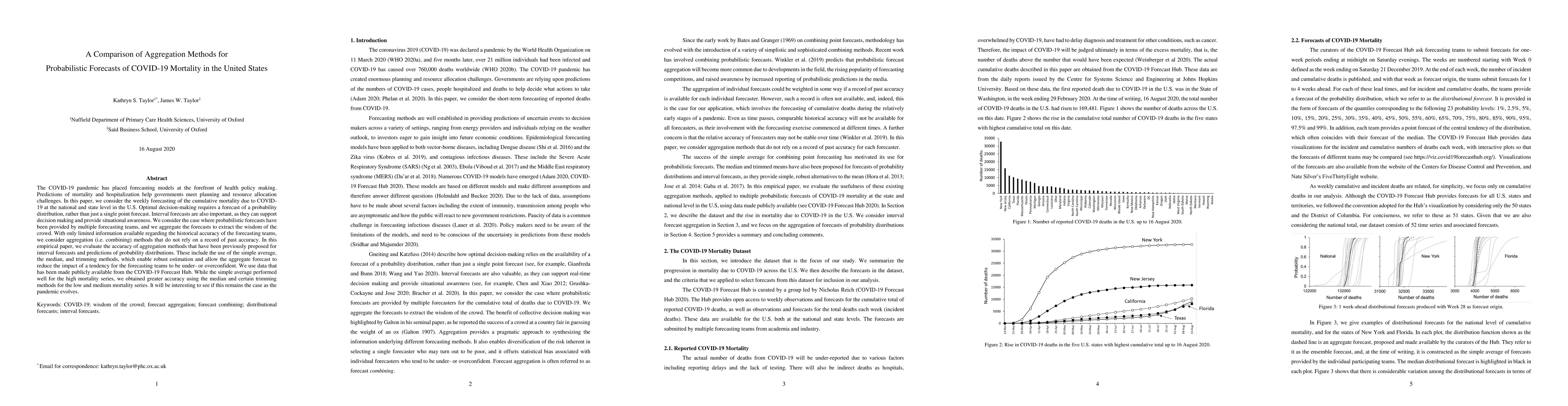This paper evaluates various aggregation methods for combining probabilistic forecasts of COVID-19 mortality in the U.S., finding that while simple averages are effective for high mortality regions, the median and trimming methods yield better accuracy for lower mortality areas. The study emphasizes the importance of interval forecasts in supporting health policy decisions.