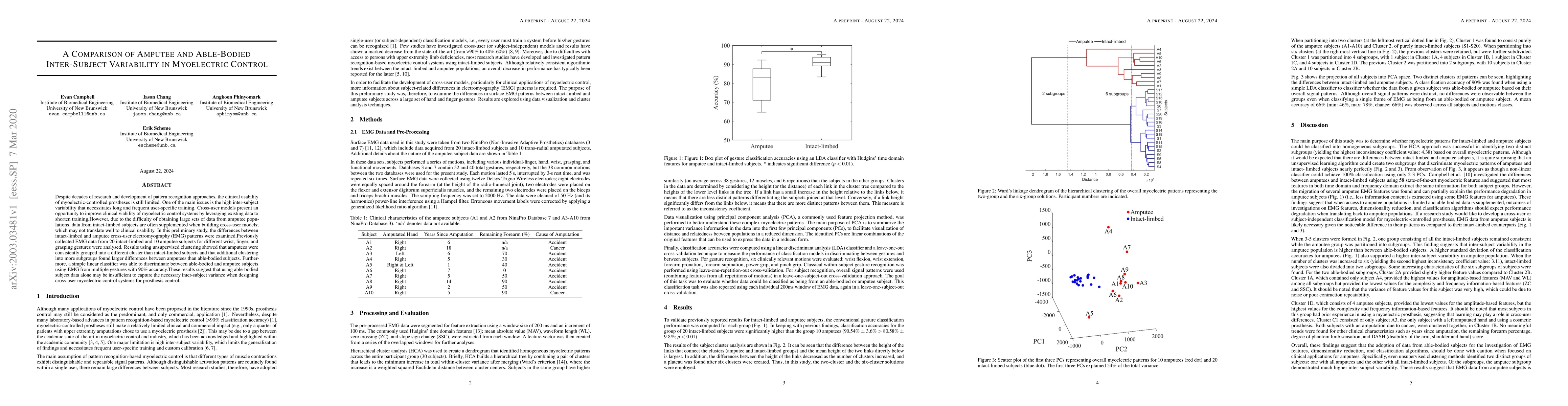 This study compares inter-subject variability in myoelectric control between amputee and able-bodied subjects, finding significant differences in electromyography (EMG) patterns. Results indicate that using able-bodied data alone may not adequately capture the necessary variance for designing effective cross-user myoelectric control systems for prostheses.