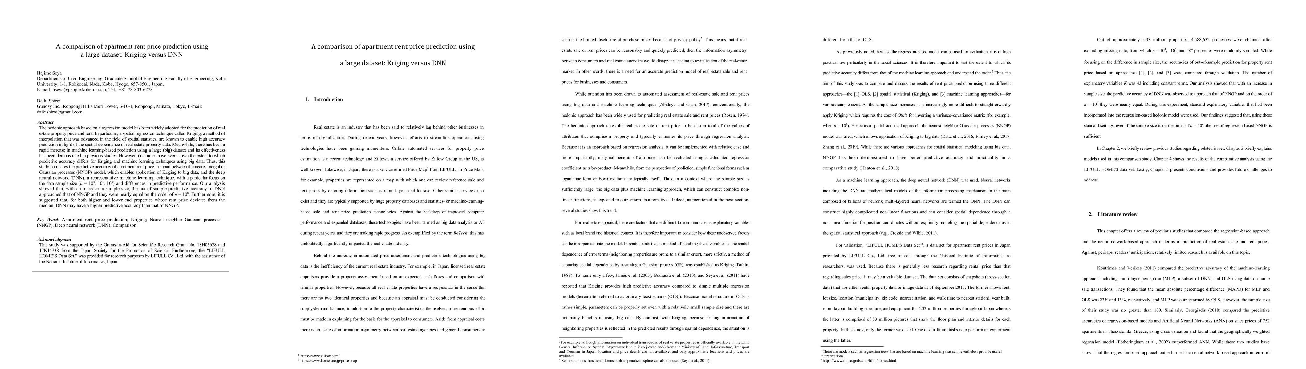 This study compares the predictive accuracy of apartment rent prices in Japan using Kriging's NNGP model and a deep neural network (DNN) with varying sample sizes. Results indicate that DNN's accuracy approaches NNGP's as sample size increases, achieving near-parity at n = 10^6, and suggesting DNN may outperform NNGP for extreme rent prices.