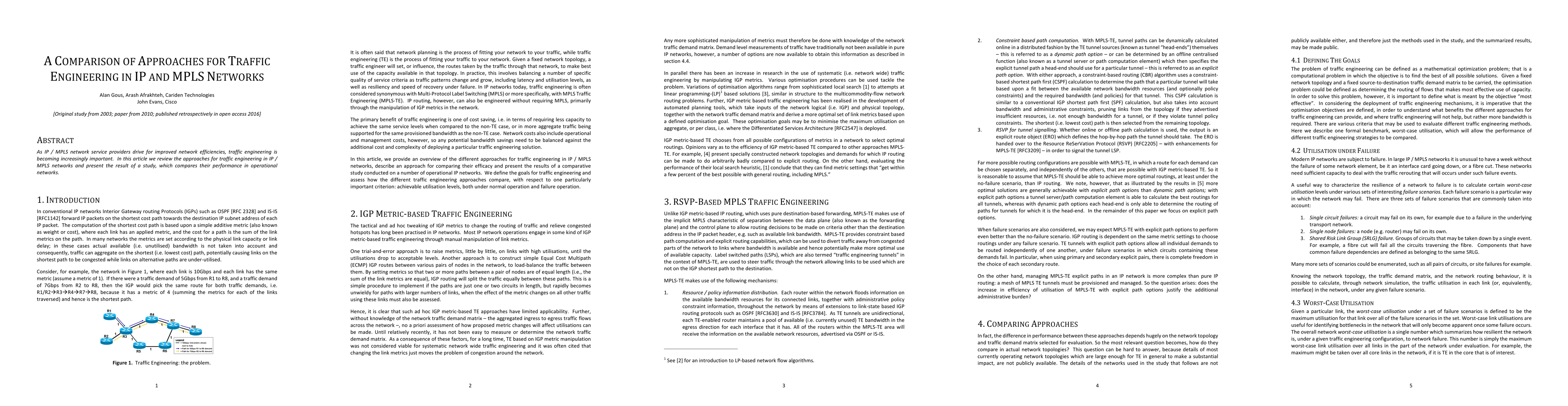 As IP / MPLS network service providers drive for improved network efficiencies, traffic engineering is becoming increasingly important. In this article we review the approaches for traffic engineering in IP / MPLS networks and present the result of a study, which compares their performance in operational networks