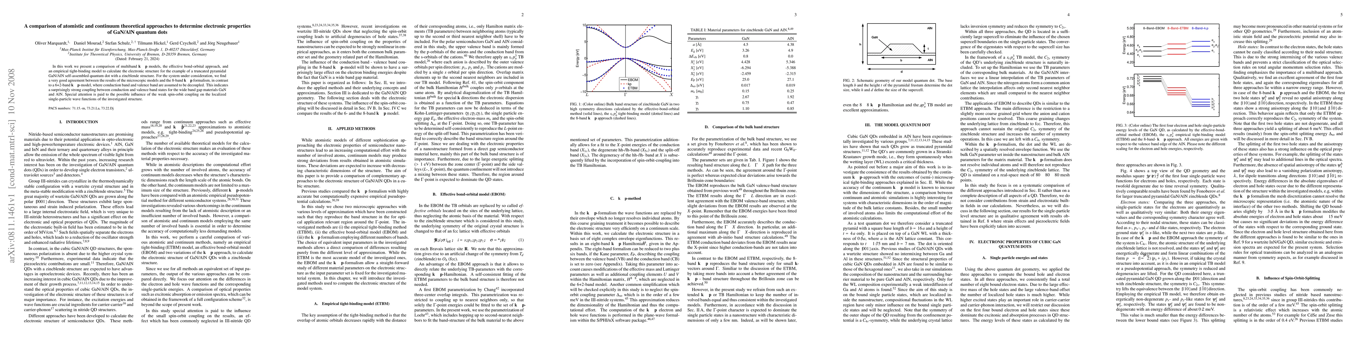 In this work we present a comparison of multiband k.p-models, the effective bond-orbital approach, and an empirical tight-binding model to calculate the electronic structure for the example of a truncated pyramidal GaN/AlN self-assembled quantum dot with a zincblende structure. For the system under consideration, we find a very good agreement between the results of the microscopic models and the 8-band k.p-formalism, in contrast to a 6+2-band k.p-model, where conduction band and valence band are assumed to be decoupled. This indicates a surprisingly strong coupling between conduction and valence band states for the wide band gap materials GaN and AlN. Special attention is paid to the possible influence of the weak spin-orbit coupling on the localized single-particle wave functions of the investigated structure.