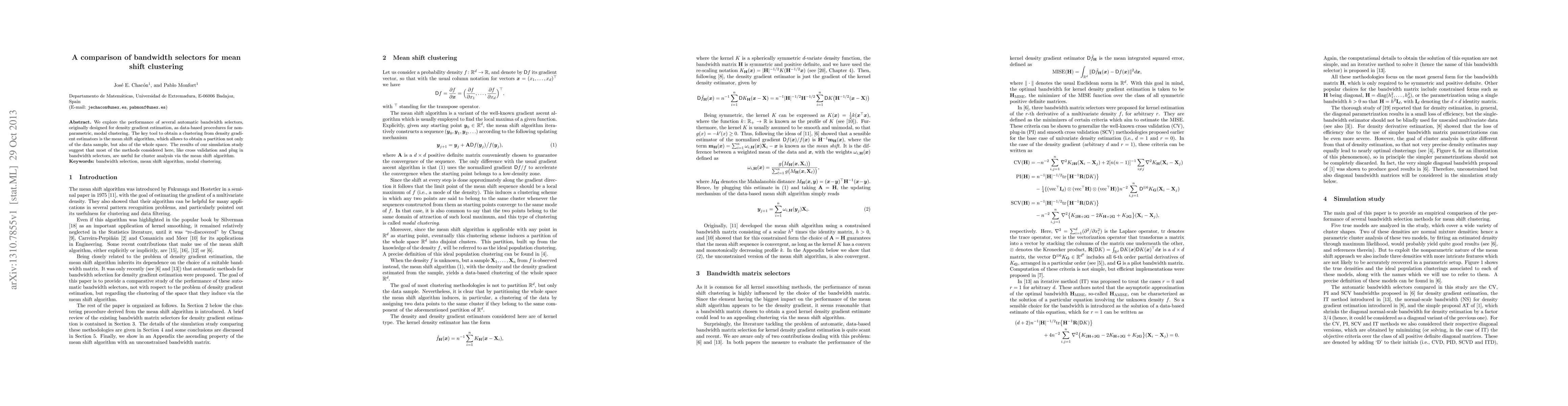 This paper evaluates various automatic bandwidth selectors for nonparametric, modal clustering using the mean shift algorithm. Simulation results indicate that methods like cross-validation and plug-in selectors are effective for cluster analysis.