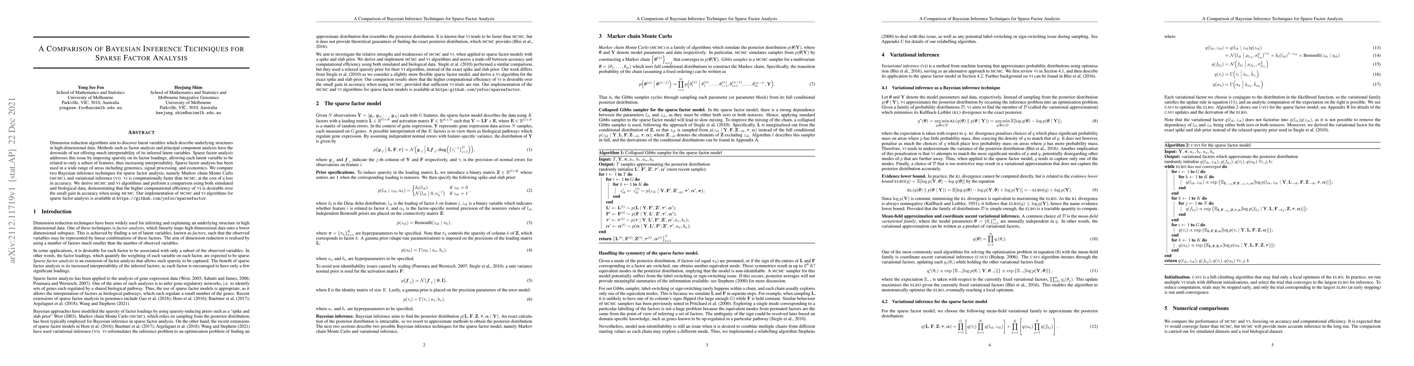 This paper compares two Bayesian inference techniques—Markov chain Monte Carlo (MCMC) and variational inference (VI)—for sparse factor analysis, highlighting VI's computational efficiency over MCMC's greater accuracy. The study demonstrates VI's practical advantages using both simulated and biological data.