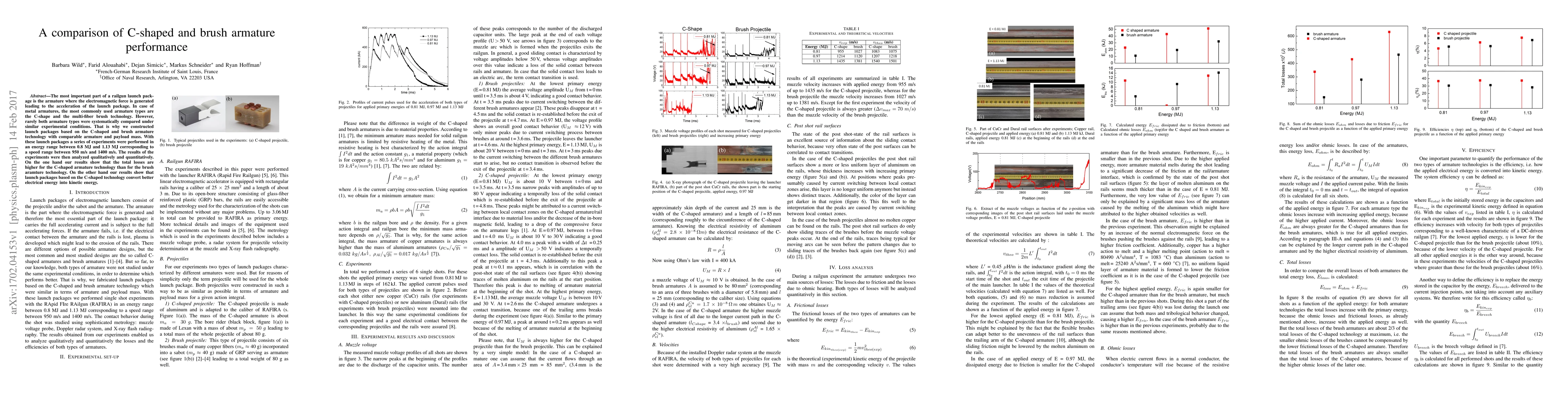 This study compares C-shaped and brush armature technologies in railguns, finding higher total losses in C-shaped armatures but better conversion of electrical energy to kinetic energy in this technology. Experiments covered an energy range from 0.8 MJ to 1.13 MJ, achieving speeds between 950 m/s and 1400 m/s.