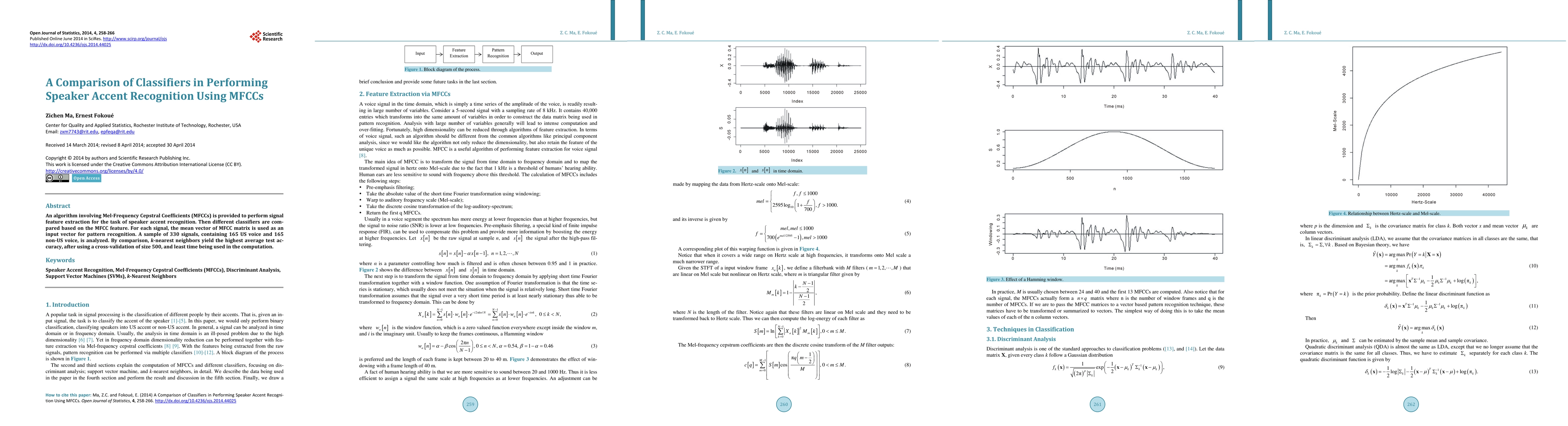 An algorithm involving Mel-Frequency Cepstral Coefficients (MFCCs) is provided to perform signal feature extraction for the task of speaker accent recognition. Then different classifiers are compared based on the MFCC feature. For each signal, the mean vector of MFCC matrix is used as an input vector for pattern recognition. A sample of 330 signals, containing 165 US voice and 165 non-US voice, is analyzed. By comparison, k-nearest neighbors yield the highest average test accuracy, after using a cross-validation of size 500, and least time being used in the computation