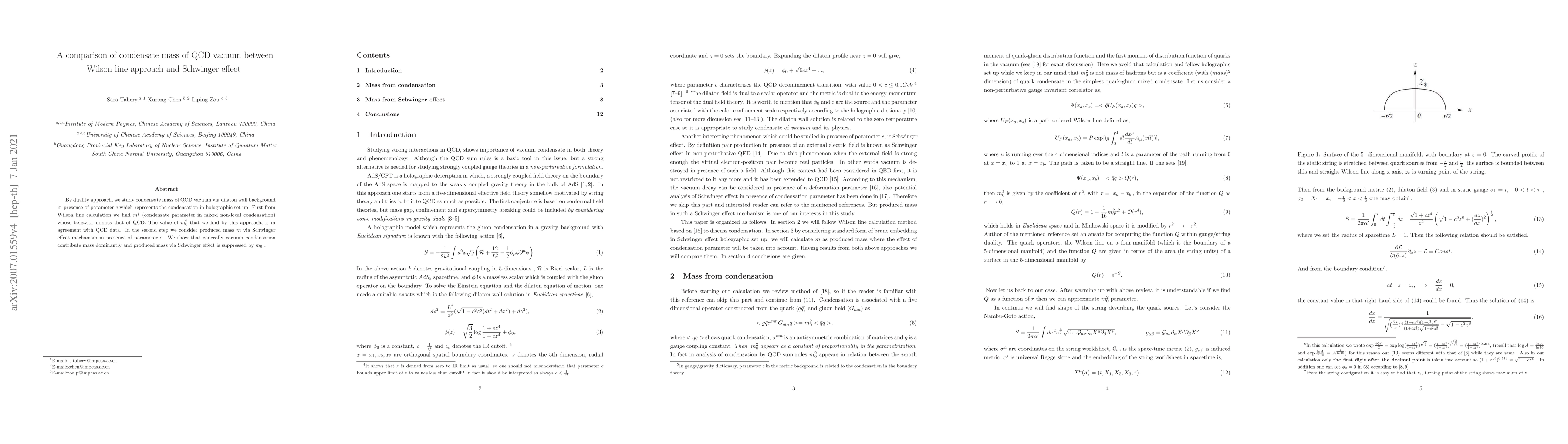 This study compares the condensate mass of the QCD vacuum using the Wilson line approach and the Schwinger effect. It finds that the condensate parameter $m^2_0$ from the Wilson line method aligns with QCD data, while the gluon condensation's mass contribution dominates over the mass produced via the Schwinger effect, which is suppressed by $m_0$.