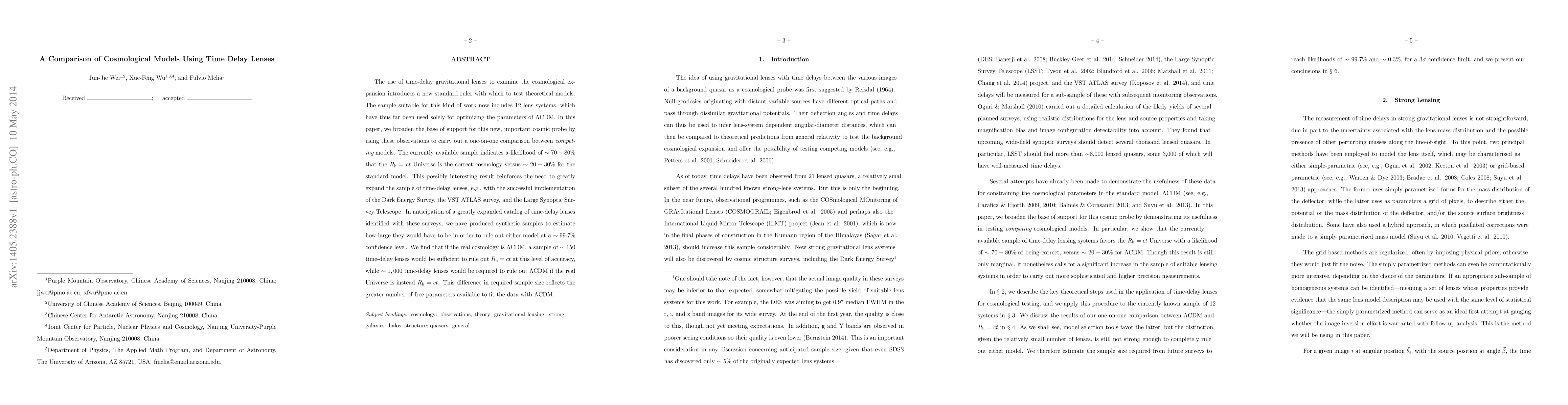 This paper compares cosmological models using time-delay gravitational lenses, finding a higher likelihood for the $R_{\rm h}=ct$ model versus the standard $\Lambda$CDM model. It estimates that significantly larger lens samples are needed to definitively rule out either model.