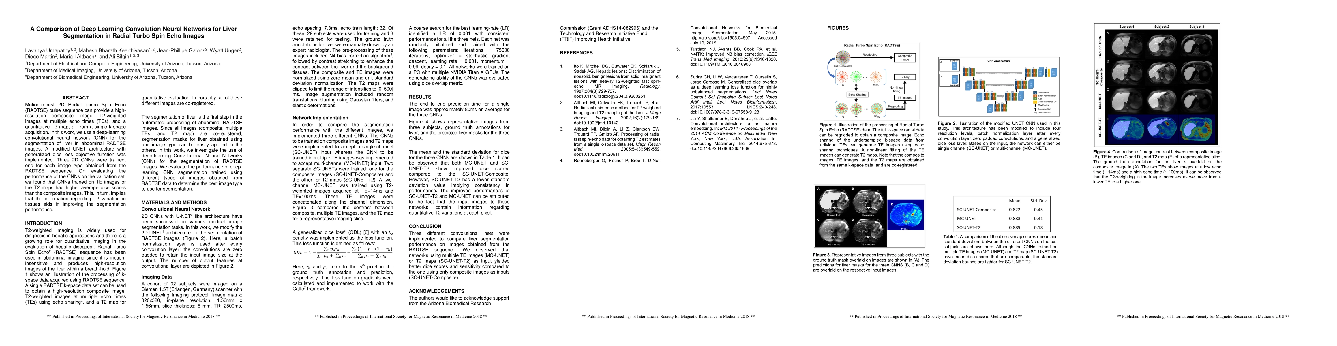 This research compares three deep learning convolutional neural networks (CNNs) for liver segmentation in Radial Turbo Spin Echo (RADTSE) images, finding that CNNs trained on T2-weighted images or T2 maps yield higher average Dice scores than those trained on composite images, suggesting T2 variation information enhances segmentation performance.