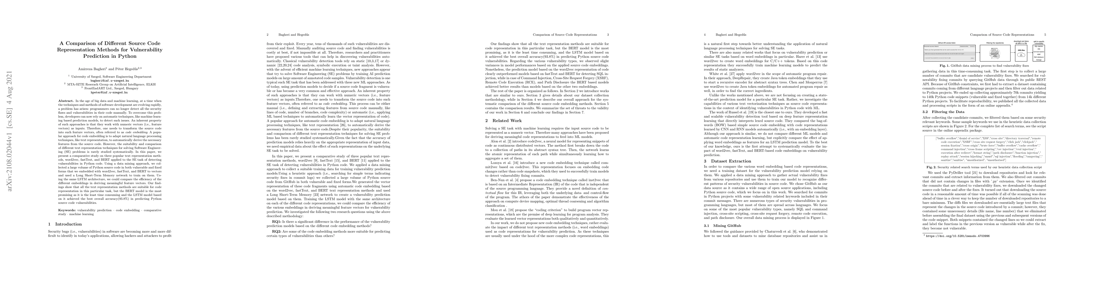 This paper compares word2vec, fastText, and BERT for representing Python source code in vulnerability prediction. The BERT model, while the most time-efficient, achieved the best accuracy (93.8%) in predicting vulnerabilities using an LSTM network.