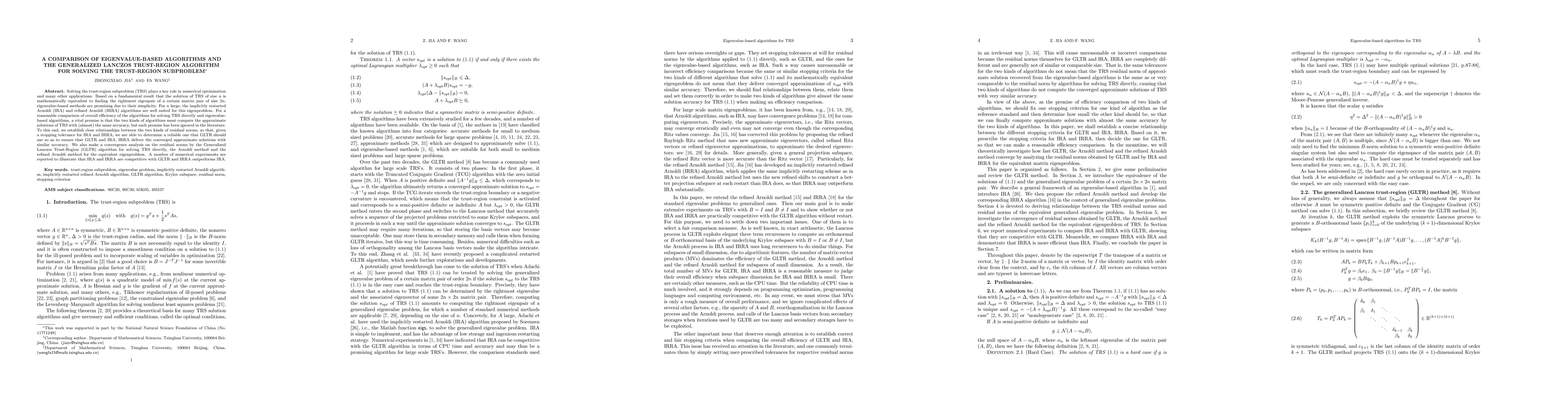 This paper compares eigenvalue-based algorithms like the implicitly restarted Arnoldi (IRA) and refined Arnoldi (IRRA) methods with the Generalized Lanczos Trust-Region (GLTR) algorithm for solving the trust-region subproblem (TRS). It establishes relationships between the residual norms of both methods to ensure similar accuracy and reports numerical experiments showing that IRA and IRRA are competitive with GLTR, with IRRA outperforming IRA.