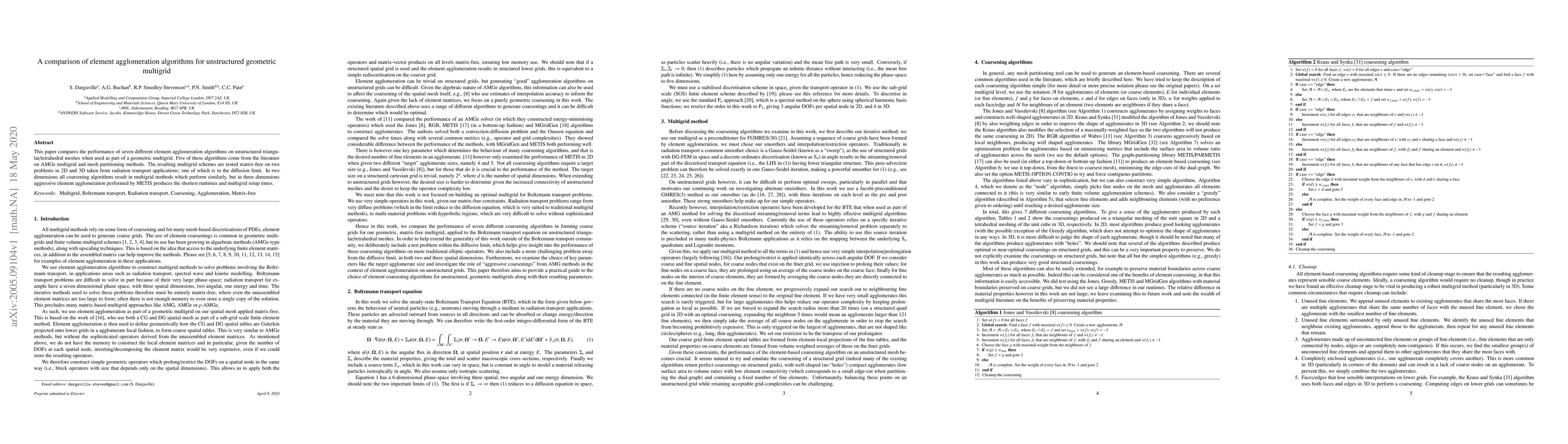 This paper evaluates seven element agglomeration algorithms for unstructured geometric multigrid, finding that while all algorithms perform similarly in 2D, METIS's aggressive agglomeration results in the fastest runtimes and setup times in 3D for radiation transport problems.
