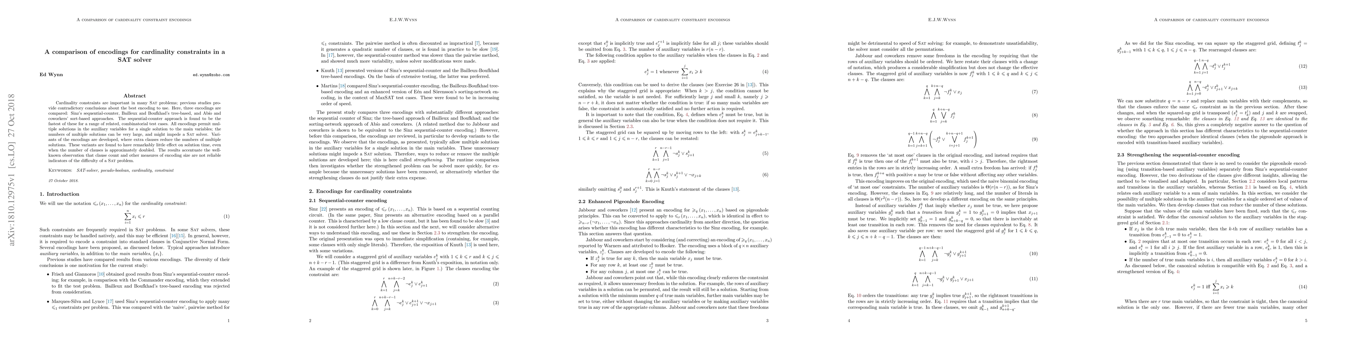 This study compares three cardinality constraint encodings in SAT solvers, finding Sinz's sequential-counter approach to be the fastest. Variants reducing multiple solutions through extra clauses show minimal impact on solution time, highlighting that encoding size does not reliably predict SAT problem difficulty.
