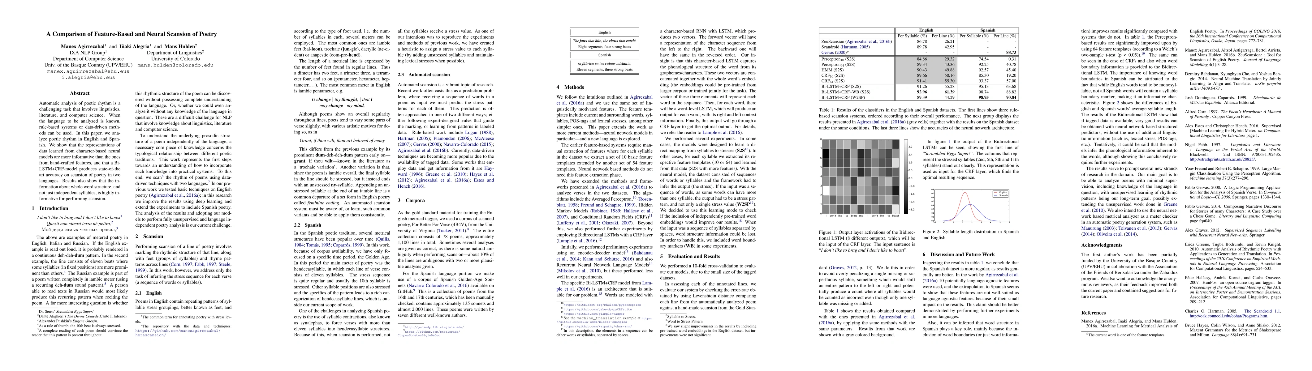 This paper compares feature-based and neural methods for automatic scansion of poetry, finding that neural models, specifically a Bi-LSTM+CRF model, achieve superior accuracy over traditional feature-based approaches. The study highlights the importance of whole word structure in scansion over independent syllables.
