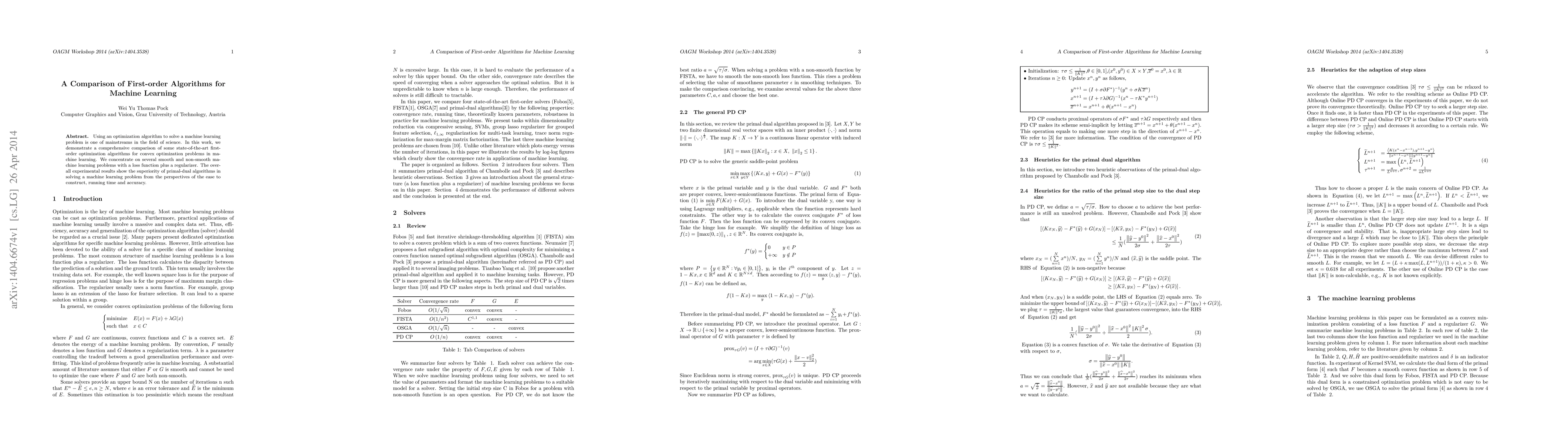 This paper compares various state-of-the-art first-order optimization algorithms for convex optimization problems in machine learning, focusing on both smooth and non-smooth problems. The study concludes that primal-dual algorithms outperform others in terms of construction ease, running time, and accuracy.