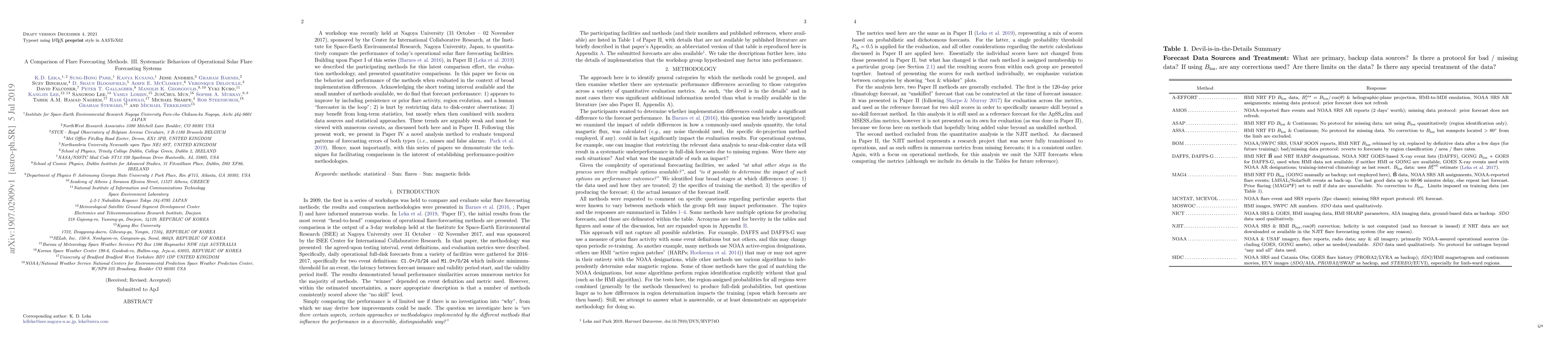 A workshop was recently held at Nagoya University (31 October - 02 November 2017), sponsored by the Center for International Collaborative Research, at the Institute for Space-Earth Environmental Research, Nagoya University, Japan, to quantitatively compare the performance of today's operational solar flare forecasting facilities. Building upon Paper I of this series (Barnes et al. 2016), in Paper II (Leka et al. 2019) we described the participating methods for this latest comparison effort, the evaluation methodology, and presented quantitative comparisons. In this paper we focus on the behavior and performance of the methods when evaluated in the context of broad implementation differences. Acknowledging the short testing interval available and the small number of methods available, we do find that forecast performance: 1) appears to improve by including persistence or prior flare activity, region evolution, and a human "forecaster in the loop"; 2) is hurt by restricting data to disk-center observations; 3) may benefit from long-term statistics, but mostly when then combined with modern data sources and statistical approaches. These trends are arguably weak and must be viewed with numerous caveats, as discussed both here and in Paper II. Following this present work, we present in Paper IV a novel analysis method to evaluate temporal patterns of forecasting errors of both types (i.e., misses and false alarms; Park et al. 2019). Hence, most importantly, with this series of papers we demonstrate the techniques for facilitating comparisons in the interest of establishing performance-positive methodologies.