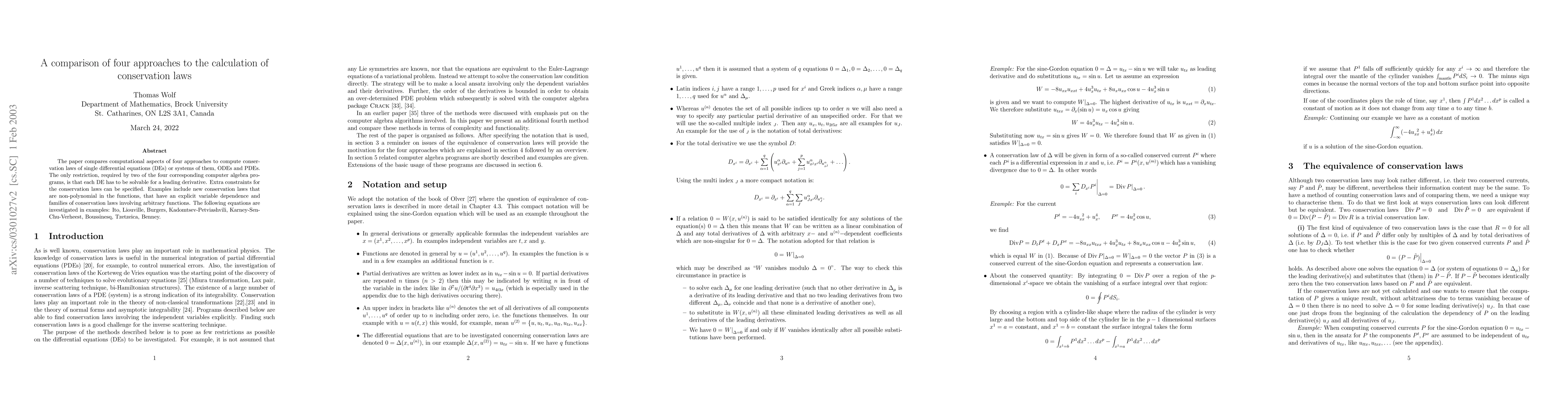 The paper compares computational aspects of four approaches to compute conservation laws of single differential equations (DEs) or systems of them, ODEs and PDEs. The only restriction, required by two of the four corresponding computer algebra programs, is that each DE has to be solvable for a leading derivative. Extra constraints for the conservation laws can be specified. Examples include new conservation laws that are non-polynomial in the functions, that have an explicit variable dependence and families of conservation laws involving arbitrary functions. The following equations are investigated in examples: Ito, Liouville, Burgers, Kadomtsev-Petviashvili, Karney-Sen-Chu-Verheest, Boussinesq, Tzetzeica, Benney.