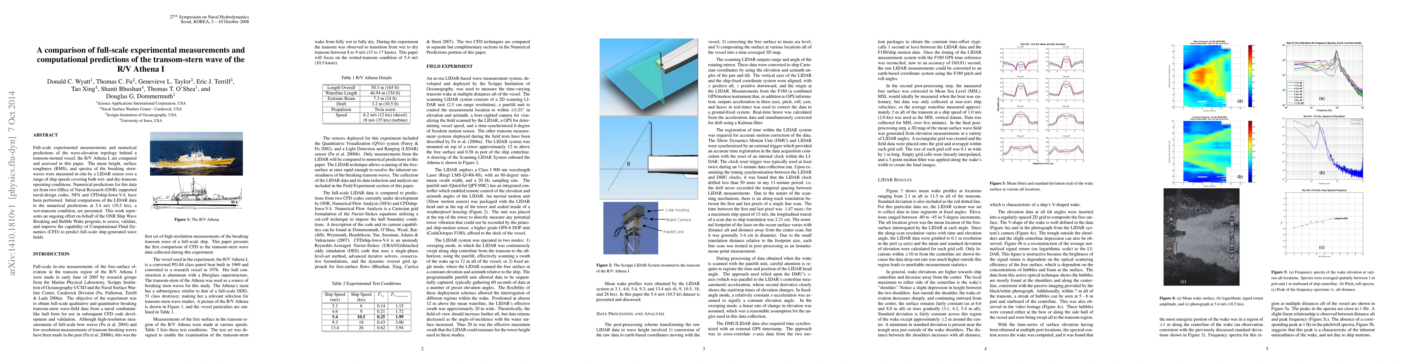 Full-scale experimental measurements and numerical predictions of the wave-elevation topology behind a transom-sterned vessel, the R/V Athena I, are compared and assessed in this paper. The mean height, surface roughness (RMS), and spectra of the breaking stern-waves were measured in-situ by a LIDAR sensor over a range of ship speeds covering both wet- and dry-transom operating conditions. Numerical predictions for this data set from two Office of Naval Research (ONR) supported naval-design codes, NFA and CFDship-Iowa-V.4, have been performed. Initial comparisons of the LIDAR data to the numerical predictions at 5.4 m/s (10.5 kts), a wet-transom condition, are presented. This work represents an ongoing effort on behalf of the ONR Ship Wave Breaking and Bubble Wake program, to assess, validate, and improve the capability of Computational Fluid Dynamics (CFD) to predict full-scale ship-generated wave fields.