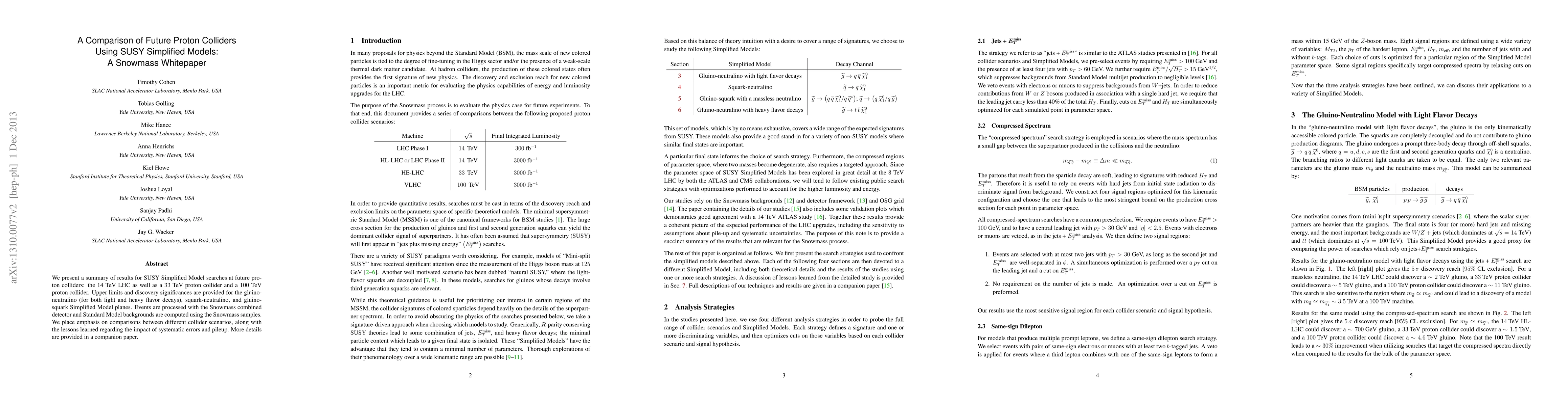 We present a summary of results for SUSY Simplified Model searches at future proton colliders: the 14 TeV LHC as well as a 33 TeV proton collider and a 100 TeV proton collider. Upper limits and discovery significances are provided for the gluino-neutralino (for both light and heavy flavor decays), squark-neutralino, and gluino-squark Simplified Model planes. Events are processed with the Snowmass combined detector and Standard Model backgrounds are computed using the Snowmass samples. We place emphasis on comparisons between different collider scenarios, along with the lessons learned regarding the impact of systematic errors and pileup. More details are provided in a companion paper.