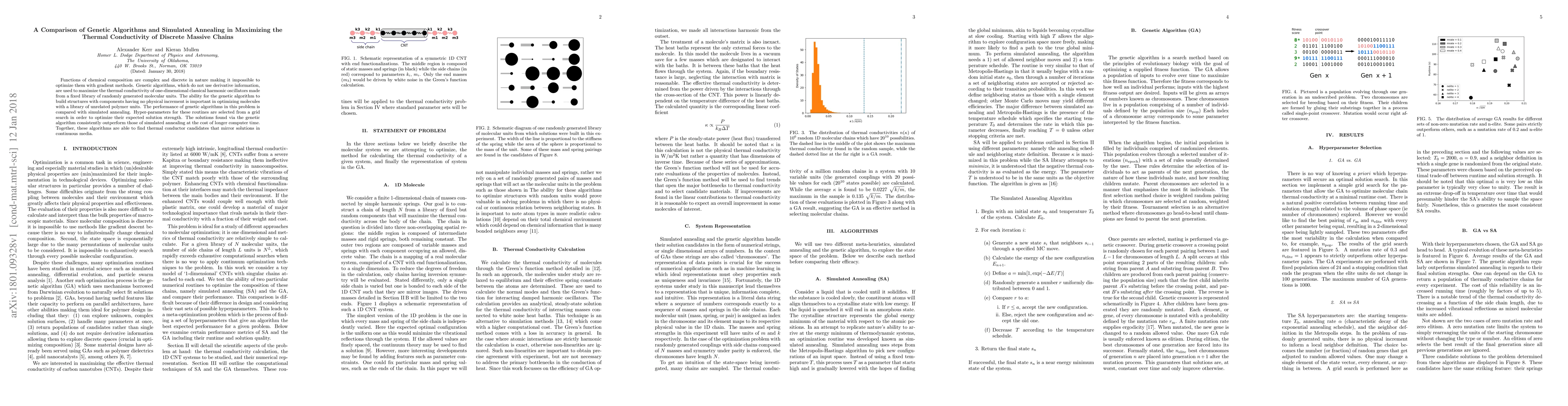 Genetic algorithms outperform simulated annealing in finding optimal thermal conductivity for discrete massive chains, but require longer computer time.