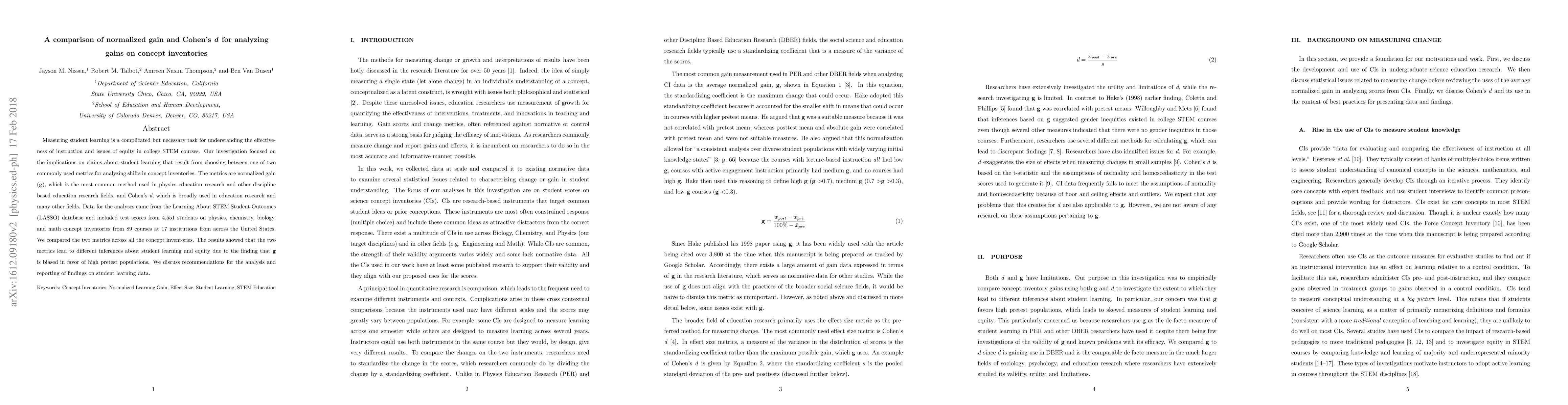 Measuring student learning is a complicated but necessary task for understanding the effectiveness of instruction and issues of equity in college STEM courses. Our investigation focused on the implications on claims about student learning that result from choosing between one of two commonly used methods for analyzing shifts in concept inventories. The methods are: Hake's gain (g), which is the most common method used in physics education research and other discipline based education research fields, and Cohen's d, which is broadly used in education research and many other fields. Data for the analyses came from the Learning Assistant Supported Student Outcomes (LASSO) database and included test scores from 4,551 students on physics, chemistry, biology, and math concept inventories from 89 courses at 17 institutions from across the United States. We compared the two methods across all of the concept inventories. The results showed that the two methods led to different inferences about student learning and equity due to g being biased in favor of high pretest populations. Recommendations for the analysis and reporting of findings on student learning data are included.