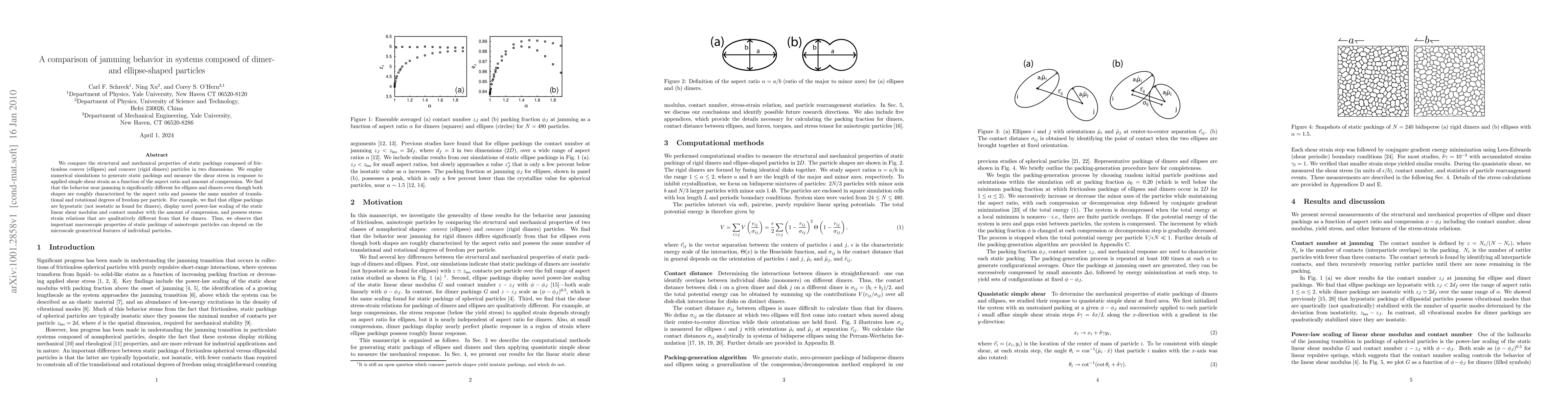 This paper compares jamming behavior in two-dimensional packings of ellipses and rigid dimers, revealing that despite similar degrees of freedom, ellipse packings exhibit hypostaticity, unique scaling laws, and distinct stress-strain relations compared to dimers, highlighting the influence of particle geometry on macroscopic properties.