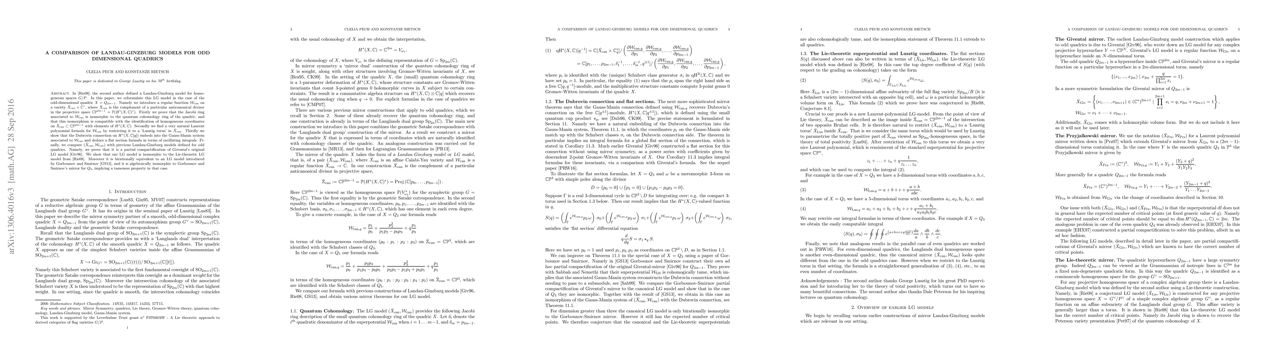 In [Rie08], the second author defined a Landau-Ginzburg model for homogeneous spaces G/P. In this paper, we reformulate this LG model in the case of the odd-dimensional quadric X=Q_{2m-1}. Namely we introduce a regular function Wcan on a variety Xcan x C*, where Xcan is the complement of a particular anticanonical divisor in the the projective space CP^{2m-1}=P(H*(X,C)*). Firstly we prove that the Jacobi ring associated to Wcan is isomorphic to the quantum cohomology ring of the quadric, and that this isomorphism is compatible with the identification of homogeneous coordinates on Xcan with elements of H*(X,C). Secondly we find a very natural Laurent polynomial formula for Wcan by restricting it to a `Lusztig torus' in Xcan. Thirdly we show that the Dubrovin connection on H*(X,C[q]) embeds into the Gauss-Manin system associated to Wcan and deduce a flat section formula in terms of oscillating integrals. Finally, we compare (Xcan,Wcan) with previous Landau-Ginzburg models defined for odd quadrics. Namely, we prove that it is a partial compactification of Givental's original LG model [Giv96]. We show that our LG model is isomorphic to the Lie-theoretic LG model from [Rie08]. Moreover it is birationally equivalent to an LG model introduced by Gorbounov and Smirnov [GS13], and it is algebraically isomorphic to Gorbounov and Smirnov's mirror for Q_3, implying a tameness property in that case.