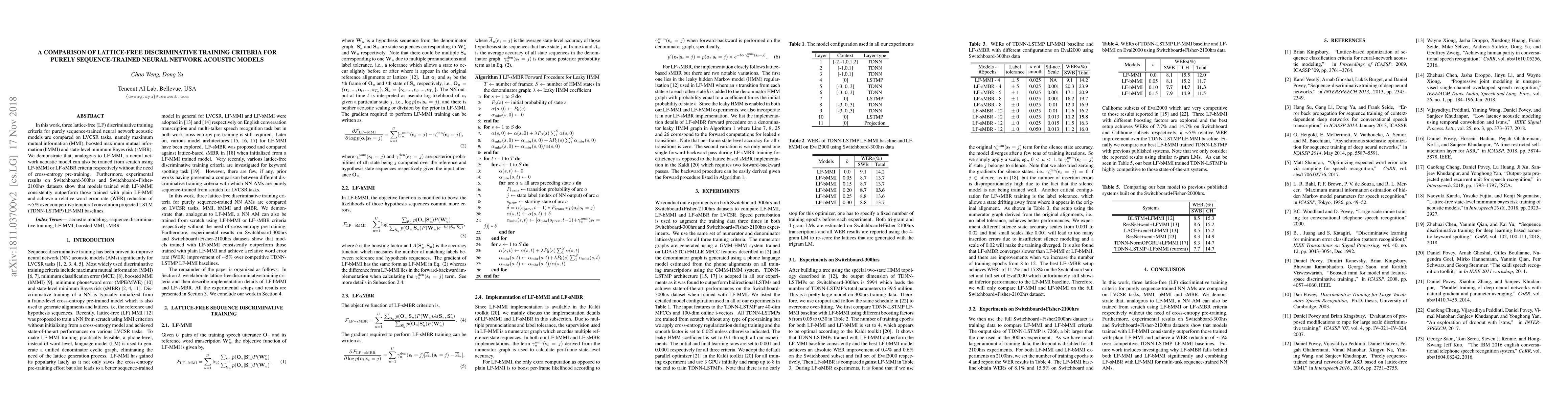 This paper compares three lattice-free discriminative training criteria—MMI, bMMI, and sMBR—for sequence-trained neural network acoustic models, showing that bMMI outperforms MMI and achieves a 5% relative WER reduction on large LVCSR datasets.