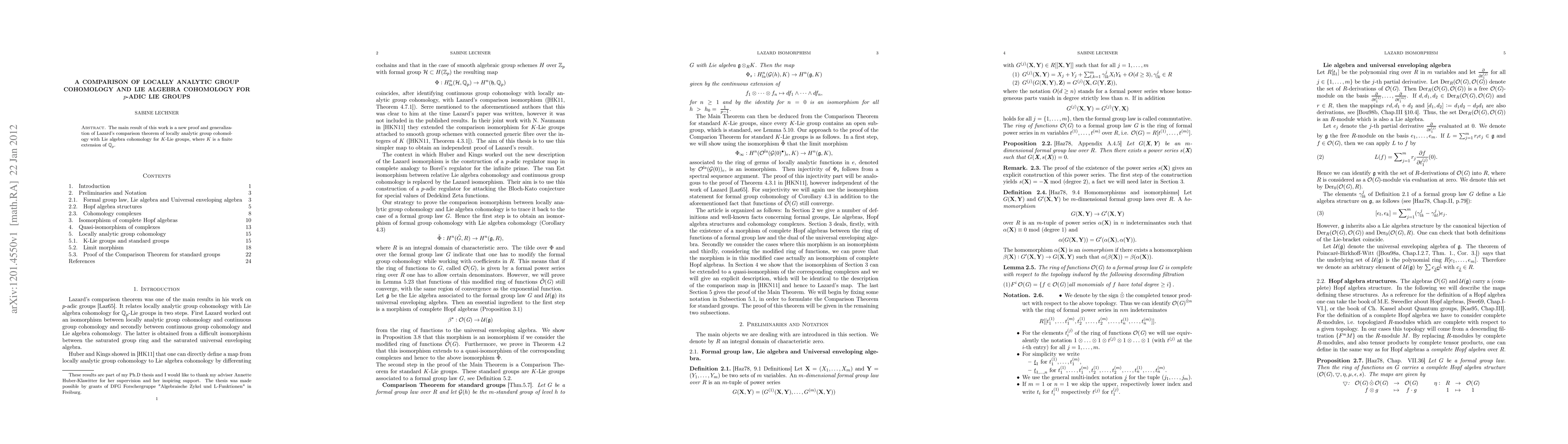 This paper presents a new proof for the generalization of Lazard's comparison theorem between locally analytic group cohomology and Lie algebra cohomology for K-Lie groups, using formal group laws and demonstrating an isomorphism through an open subgroup U of G. The proof is independent of previous methods.
