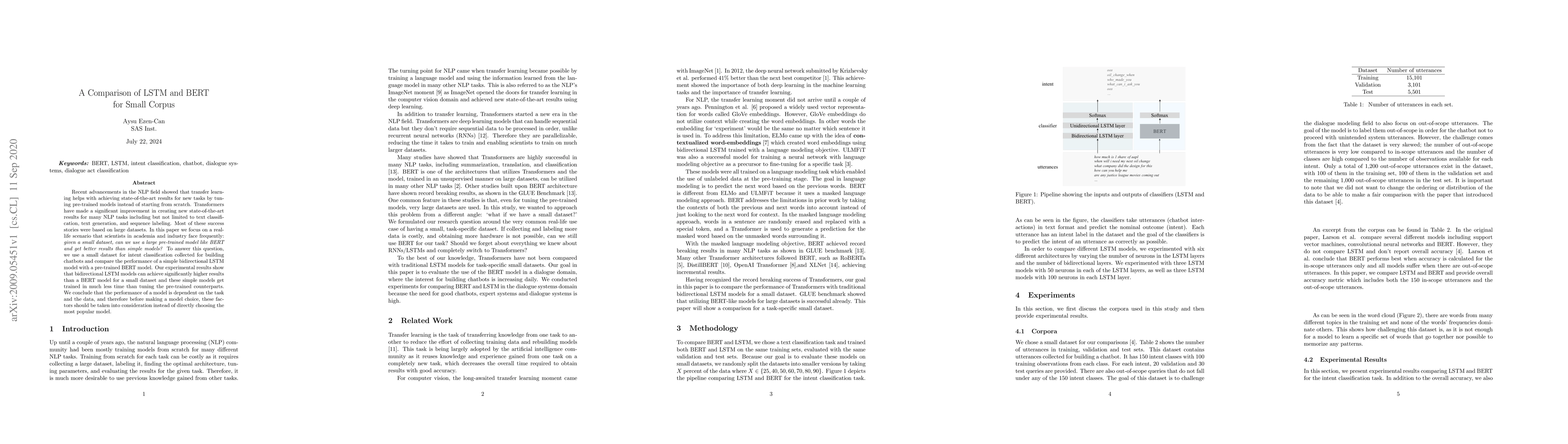 Recent advancements in the NLP field showed that transfer learning helps with achieving state-of-the-art results for new tasks by tuning pre-trained models instead of starting from scratch. Transformers have made a significant improvement in creating new state-of-the-art results for many NLP tasks including but not limited to text classification, text generation, and sequence labeling. Most of these success stories were based on large datasets. In this paper we focus on a real-life scenario that scientists in academia and industry face frequently: given a small dataset, can we use a large pre-trained model like BERT and get better results than simple models? To answer this question, we use a small dataset for intent classification collected for building chatbots and compare the performance of a simple bidirectional LSTM model with a pre-trained BERT model. Our experimental results show that bidirectional LSTM models can achieve significantly higher results than a BERT model for a small dataset and these simple models get trained in much less time than tuning the pre-trained counterparts. We conclude that the performance of a model is dependent on the task and the data, and therefore before making a model choice, these factors should be taken into consideration instead of directly choosing the most popular model.