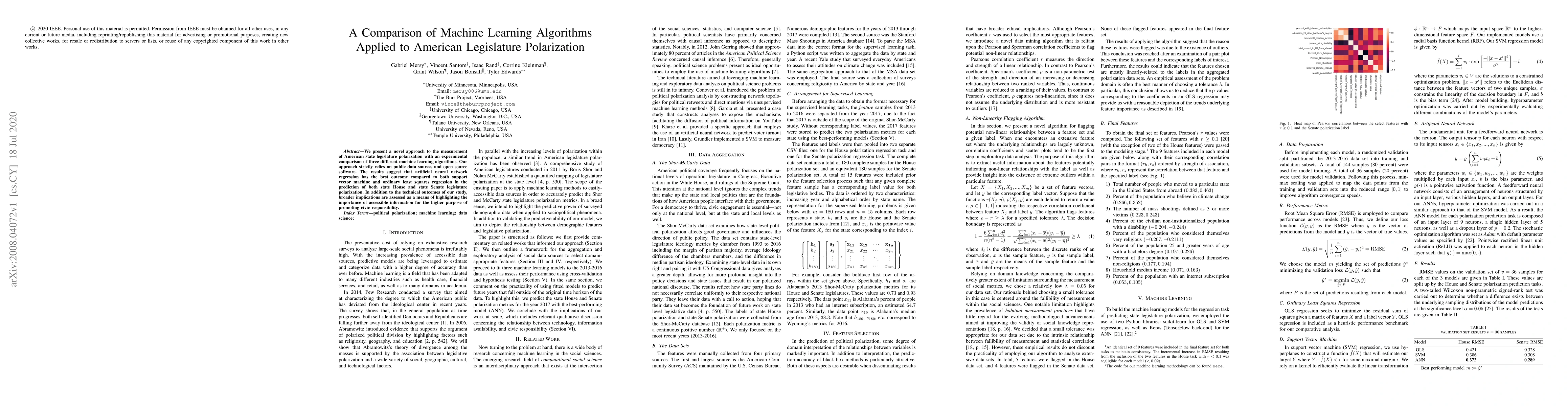 This study compares three machine learning algorithms—artificial neural network regression, support vector machine, and ordinary least squares regression—to measure American state legislature polarization using public data. The results indicate that artificial neural network regression outperforms the others in predicting polarization, emphasizing the value of open data for civic engagement.