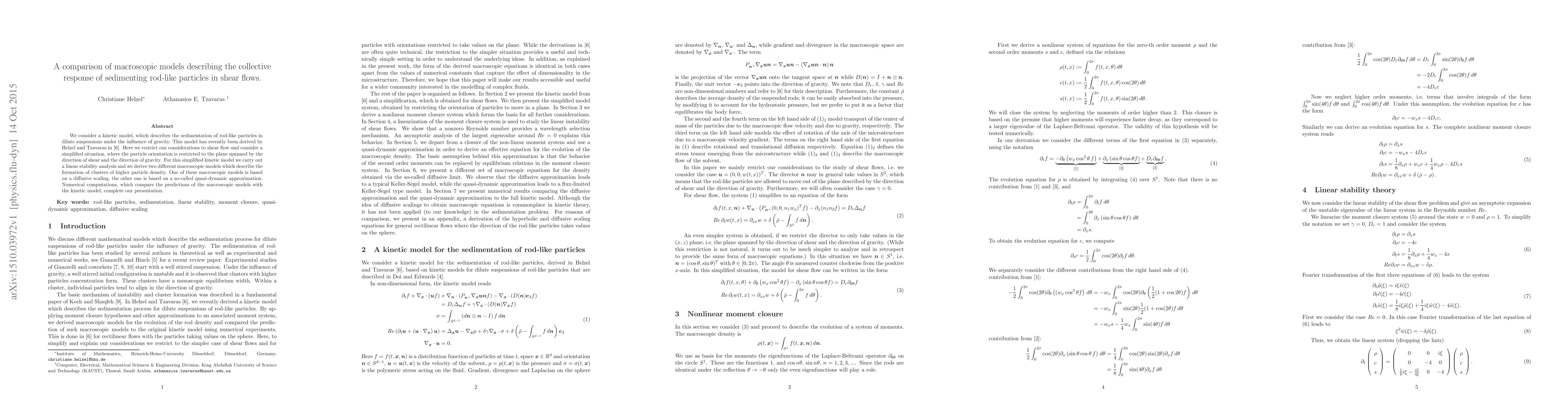 We consider a kinetic model, which describes the sedimentation of rod-like particles in dilute suspensions under the influence of gravity. This model has recently been derived by Helzel and Tzavaras in \cite{HT2015}. Here we restrict our considerations to shear flow and consider a simplified situation, where the particle orientation is restricted to the plane spanned by the direction of shear and the direction of gravity. For this simplified kinetic model we carry out a linear stability analysis and we derive two different macroscopic models which describe the formation of clusters of higher particle density. One of these macroscopic models is based on a diffusive scaling, the other one is based on a so-called quasi-dynamic approximation. Numerical computations, which compare the predictions of the macroscopic models with the kinetic model, complete our presentation.
