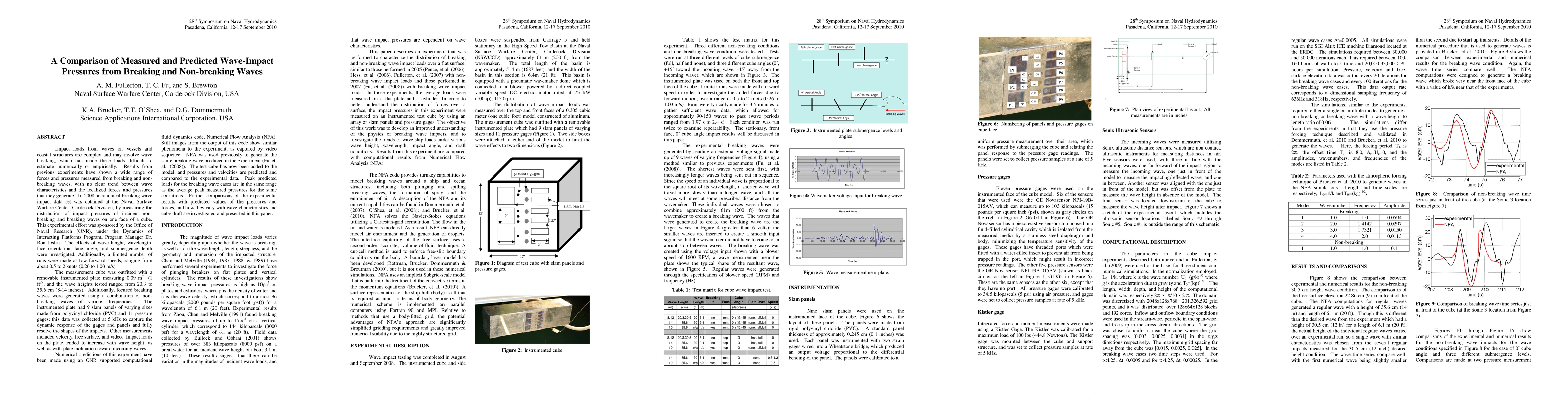 Impact loads from waves on vessels and coastal structures are complex and may involve wave breaking, which has made these loads difficult to estimate numerically or empirically. Results from previous experiments have shown a wide range of forces and pressures measured from breaking and nonbreaking waves, with no clear trend between wave characteristics and the localized forces and pressures that they generate. In 2008, a canonical breaking wave impact data set was obtained at the Naval Surface Warfare Center, Carderock Division, by measuring the distribution of impact pressures of incident nonbreaking and breaking waves on one face of a cube. This experimental effort was sponsored by the Office of Naval Research (ONR), under the Dynamics of Interacting Platforms Program, Program Manager Dr. Ron Joslin. The effects of wave height, wavelength, face orientation, face angle, and submergence depth were investigated. Additionally, a limited number of runs were made at low forward speeds, ranging from about 0.5 to 2 knots (0.26 to 1.03 m/s).