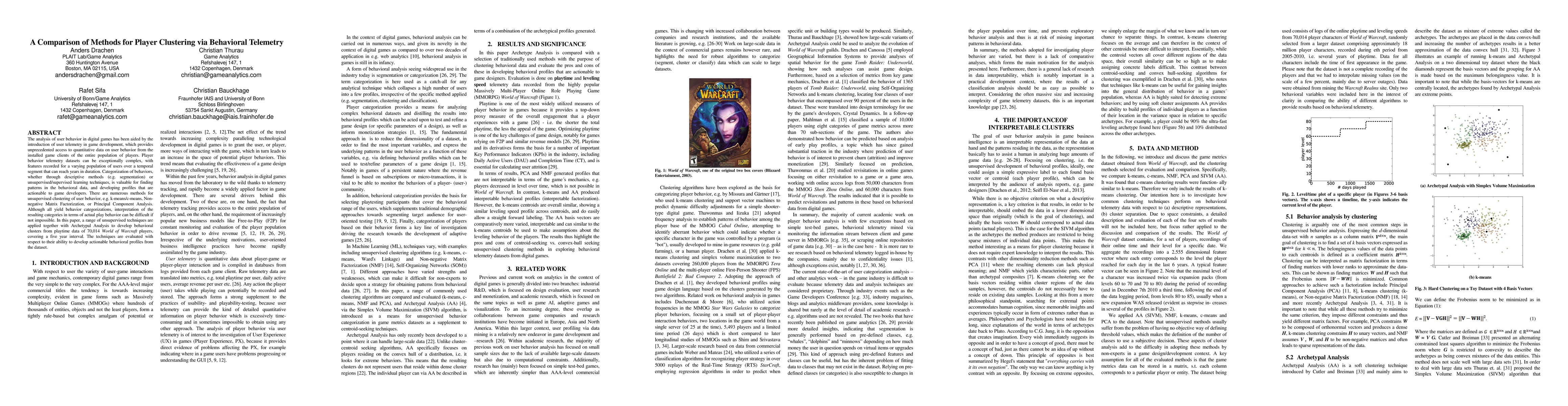 The analysis of user behavior in digital games has been aided by the introduction of user telemetry in game development, which provides unprecedented access to quantitative data on user behavior from the installed game clients of the entire population of players. Player behavior telemetry datasets can be exceptionally complex, with features recorded for a varying population of users over a temporal segment that can reach years in duration. Categorization of behaviors, whether through descriptive methods (e.g. segmention) or unsupervised/supervised learning techniques, is valuable for finding patterns in the behavioral data, and developing profiles that are actionable to game developers. There are numerous methods for unsupervised clustering of user behavior, e.g. k-means/c-means, Non-negative Matrix Factorization, or Principal Component Analysis. Although all yield behavior categorizations, interpretation of the resulting categories in terms of actual play behavior can be difficult if not impossible. In this paper, a range of unsupervised techniques are applied together with Archetypal Analysis to develop behavioral clusters from playtime data of 70,014 World of Warcraft players, covering a five year interval. The techniques are evaluated with respect to their ability to develop actionable behavioral profiles from the dataset.