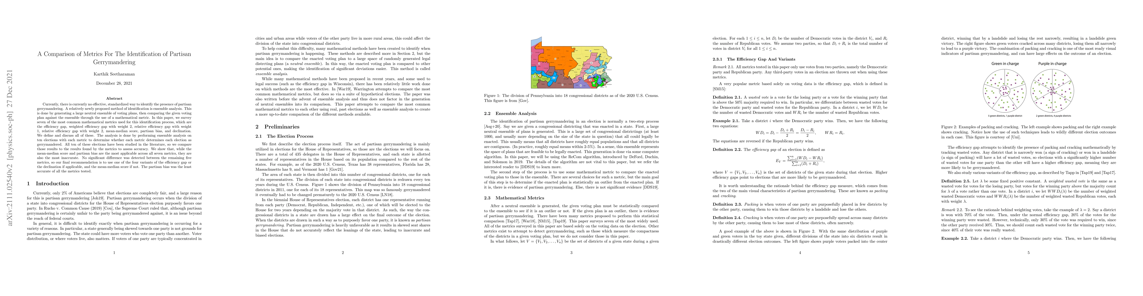 Currently, there is currently no effective, standardized way to identify the presence of partisan gerrymandering. A relatively newly proposed method of identification is ensemble analysis. This is done by generating a large neutral ensemble of voting plans, then comparing the given voting plan against the ensemble through the use of a mathematical metric. In this paper, we survey seven of the most common mathematical metrics used for this identification process, which are the efficiency gap, weighted efficiency gap with weight 2, relative efficiency gap with weight 1, relative efficiency gap with weight 2, mean-median score, partisan bias, and declination. We define and discuss all of these. The analysis is done by performing ensemble analysis on ten elections with each metric to determine whether each metric determines each election as gerrymandered. All ten of these elections have been studied in the literature, so we compare those results to the results found by the metrics to assess accuracy. We show that, while the mean-median score and partisan bias are the most applicable across all seven metrics, they are also the most inaccurate. No significant difference was detected between the remaining five metrics, so our final recommendation is to use one of the four variants of the efficiency gap or the declination if applicable, and the mean-median score if not. The partisan bias was the least accurate of all the metrics tested.